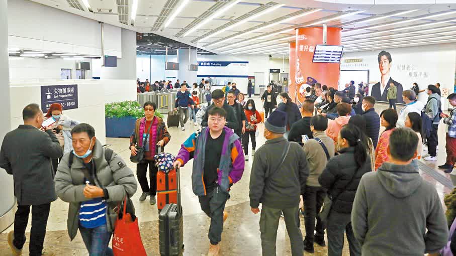 香港文匯報記者昨午到西九龍高鐵站訪察,只見在抵港大堂內,不時有數名內地旅客拖着行李箱走出高鐵站,當中夾雜着零星回港的港人。梁先生一家拖着數個行李箱由廣州返港。梁先生表示,一家大小包括7歲的女兒,前幾日趁聖誕假期回廣州探親,順便在當地遊玩幾日。他說:「阿女學校假期還剩幾天,但怕之後返港逼人,所以提前回港,打算就在香港度過之後的假期,不預備去其他地方。」