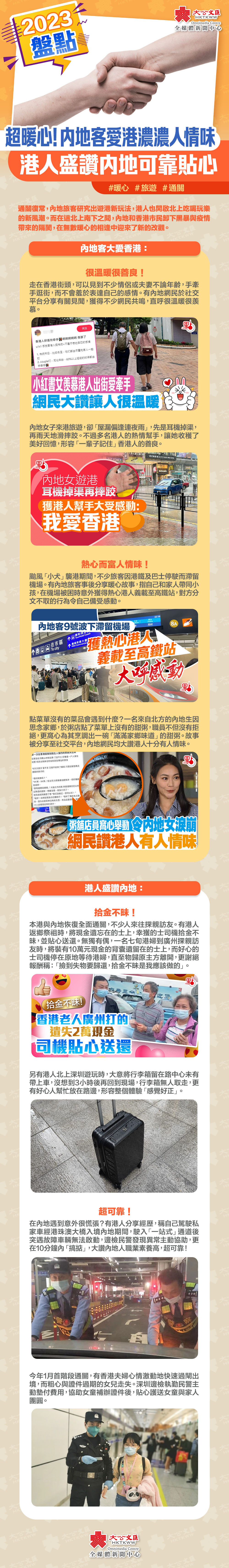 大公文匯全媒體報道,時光飛逝,歲月如梭,轉眼便是2023尾聲。說起這一年,離不開一個「新」字。通關復常,内地旅客研究出遊港新玩法:港人也開啟北上吃喝玩樂的新風潮。而在這北上南下之間,内地和香港市民卸下黑暴與疫情帶來的隔閡,在無數暖心的相逢中迎來了新的改觀。