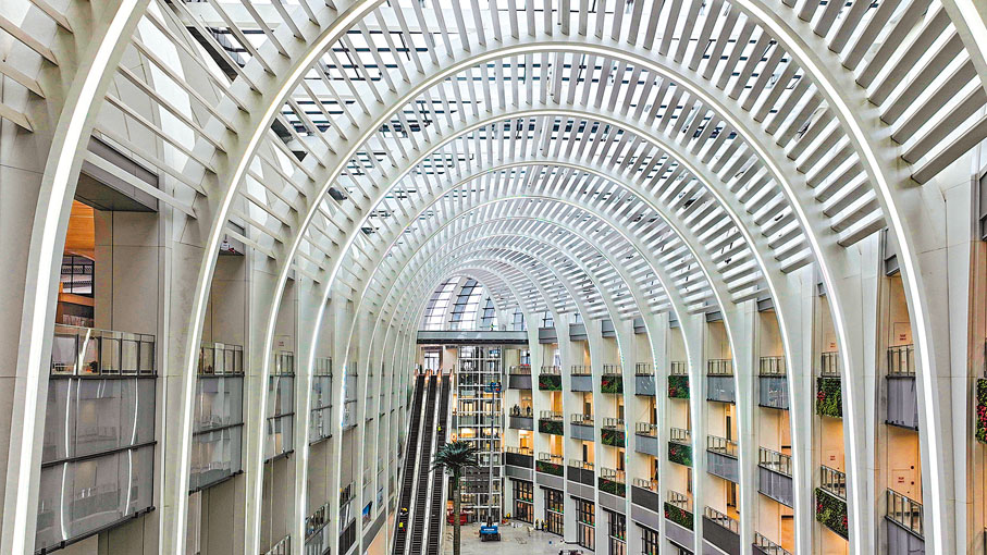 多種智能建造技術的應用巧妙融入其中。其中,自主研發鋼結構全生命周期管理平台,實現對十萬餘根鋼構件的全生命周期內質量可追溯。站房內外花瓣為異型多曲結構造型,彎、摺、曲、扭是其最大特點,最大懸挑跨度28米、最大摺角接近90度,建設團隊應用數字輔助建造技術,全面提升不同建材交叉邊界的精度控制,使花瓣曲面造型得以完美呈現。