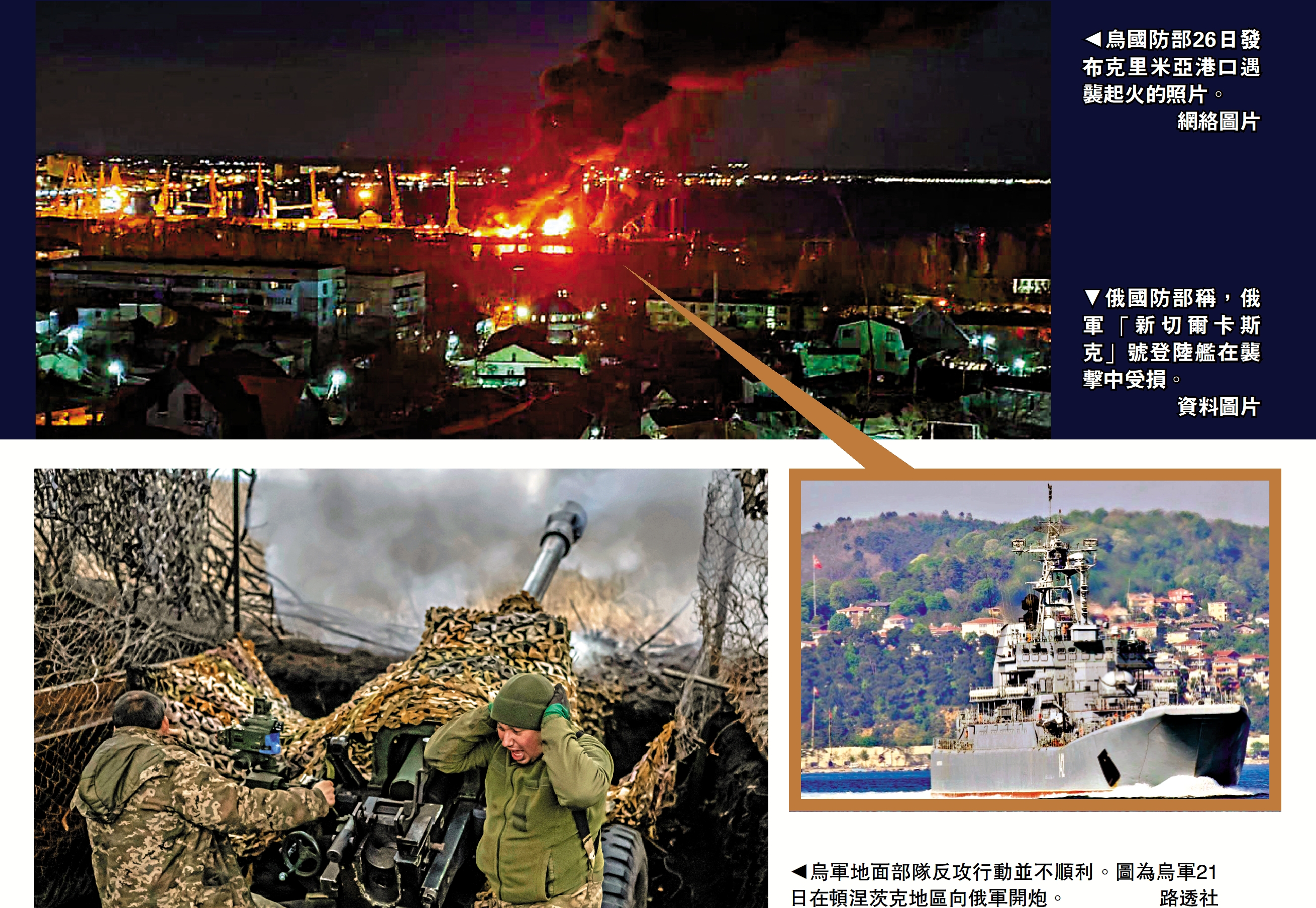 大公報綜合法新社、美聯社、塔斯社報道:烏克蘭軍隊26日凌晨發射導彈襲擊克里米亞港口城市費奧多西亞,引發爆炸和大火。烏空軍司令奧列修克稱,停泊在港口的俄軍「新切爾卡斯克」號大型登陸艦被炸毀。俄國防部稱,該登陸艦在襲擊中受損,並表示俄軍防空系統擊落了兩架發射導彈的烏軍戰機。另一方面,烏軍地面部隊反攻行動持續受挫,俄軍宣布佔領東部重鎮馬林卡。烏軍發言人爭辯稱,雖然城鎮被摧毀,但「仍有烏克蘭士兵在那裏」。