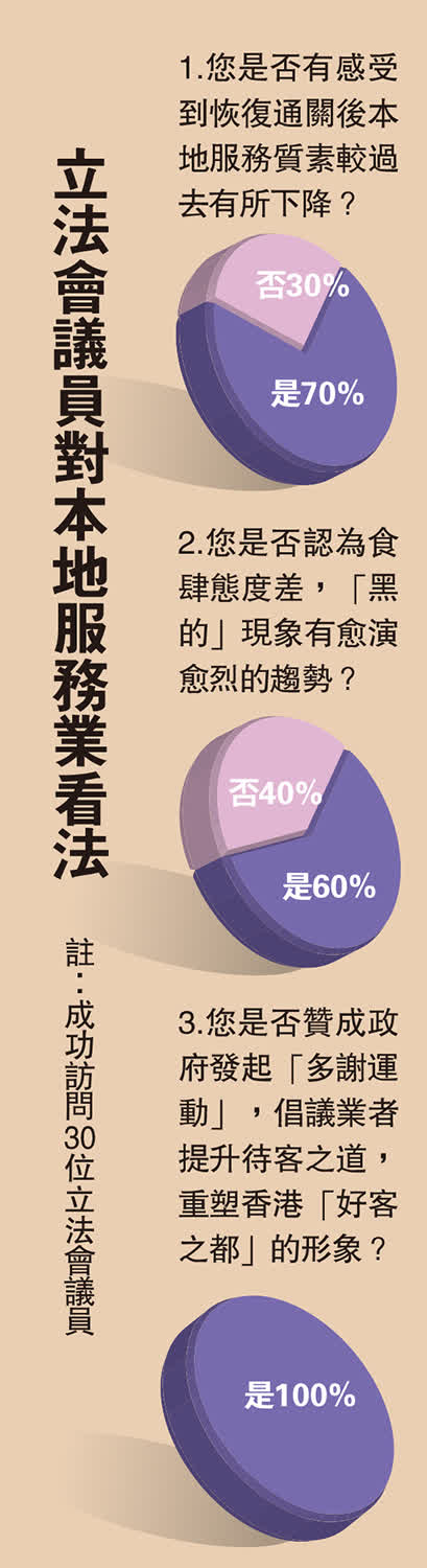 《大公報》昨日成功訪問30位立法會議員,了解他們對本地服務業的看法。結果顯示,七成議員同意,本地服務業質素在恢復通關後較過往有所下降;六成議員認為食肆態度差,「黑的」現象有愈演愈烈的趨勢;而所有議員均贊成政府發起全港「禮貌運動」,提升香港待客之道,讓旅客賓至如歸。