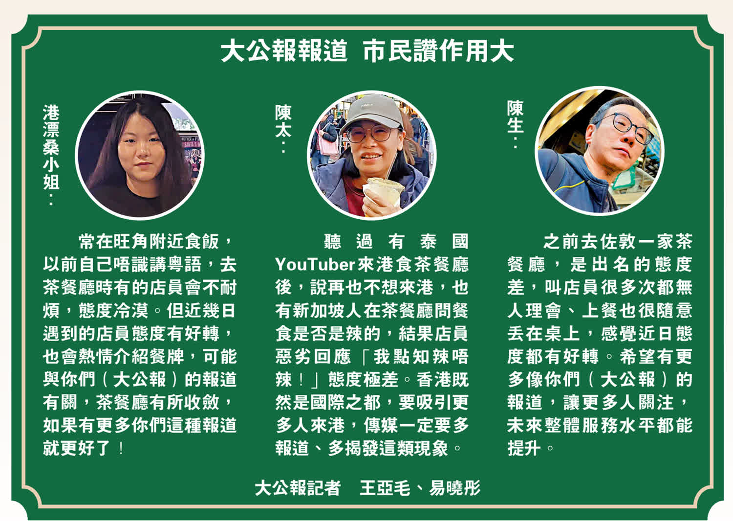 (大公報記者 調查組、李嘉琪 視頻:調查組、李嘉琪、賴蘇武)二十多年前劉德華經典廣告台詞「今時今日咁嘅服務態度唔夠㗎!」街知巷聞,時移世易,不少網民點評香港的餐飲店服務大倒退。大公報記者親身走到被劣評的食肆做「實測」,了解當中實際情況,有本地市民讚賞《大公報》有公信力,可以更客觀地反映實際情況,有劣評食肆經《大公報》報道後,日前已有收斂。