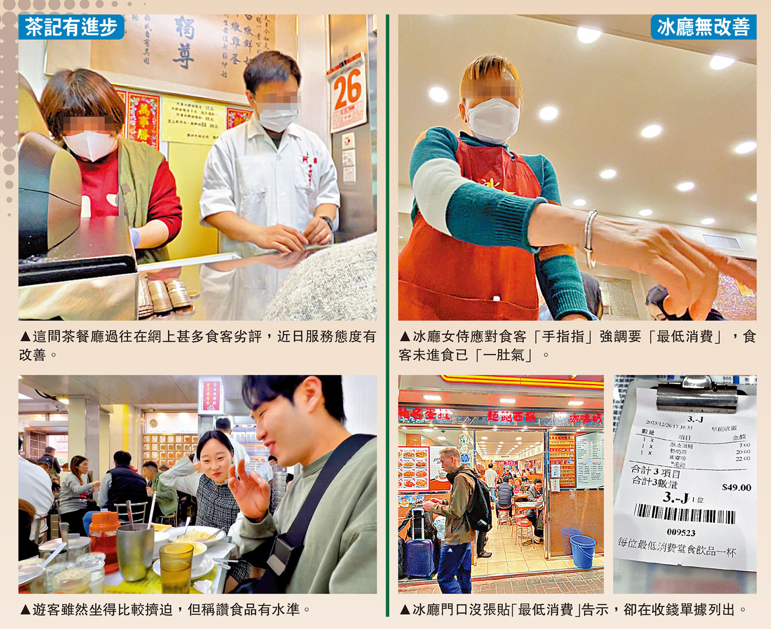 上周《大公報》實測網上劣評服務態度差的一間以菠蘿油聞名的冰廳,樓面店員指顧客不能單點蛋撻或包點,要求多點一杯飲品,並稱店內設「最低消費堂食飲品一杯」但卻沒有在店內張貼清晰告示,負責人承認消費者委員會就有關「低消」投訴向他了解,負責人還傲慢揚言顧客不喜歡最低消費可以離開。報道刊出幾天後,大公報記者二人再回訪該店,發現店內的枱面張貼「每位最低消費堂食飲品一杯」告示,收費的單據亦顯示相關字眼,記者先點一杯凍咖啡($22)和一個蛋撻($7),侍應即說每位最低消費要點一杯飲品,價目表上顯示最便宜的飲品要20元,侍應表示「如果一個叫碟飯就不用額外叫杯飲品,但若你只點包或蛋撻,就要最低消費堂食飲品一杯,不可以只吃一個包或一個蛋撻。」