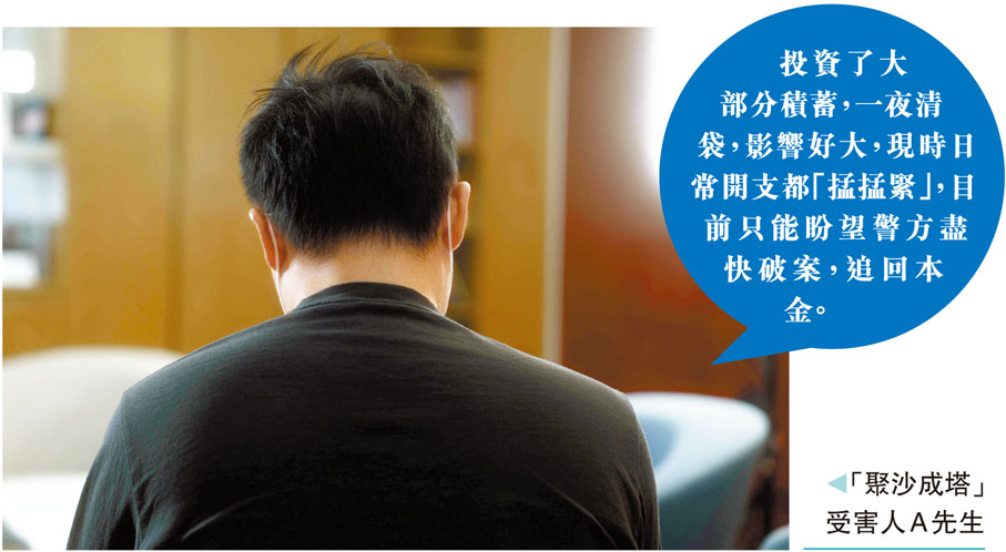 A先生由加入投資群組至發現被騙,前後經歷兩個多月,總共損失大約160萬元本金,當中50萬元屬銀行借貸,年利率約2至5厘,現時每月要還近2萬元,出糧大部分都先用來還債,估計需要一至兩年才能還清,他慨嘆「投資了大部分積蓄,一夜清袋,影響好大,現時日常開支都『掹掹緊』」,目前只能盼望警方盡快破案,追回本金,坦言面對極大的經濟及心理壓力。