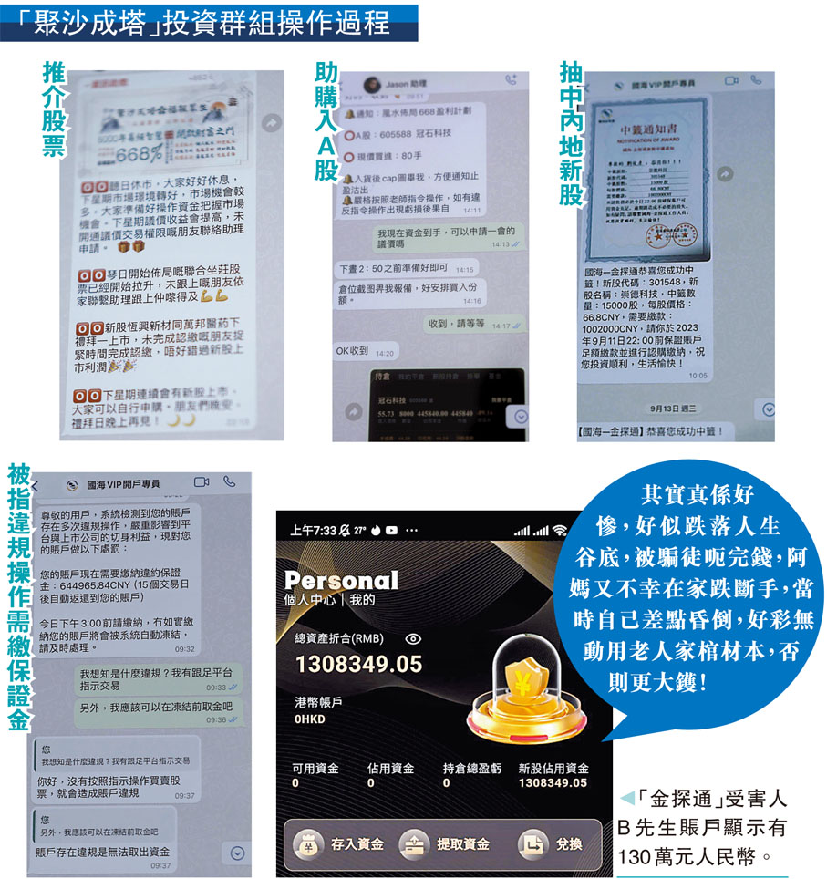 B先生起初抱懷疑態度,留意該群組近一個月,其間「曹Sir」一開始介紹港股,後來指港股前景不穩,游說組員投資較穩陣的A股,並要求組員下載「金探通」App,存錢開通「機構席位」,聲稱可以利用機構投資者的特權買賣A股。B先生見有多名熟悉的香港藝人為「曹Sir」站台,便信以為真,在8月底存錢入去「助理」提供的戶口,並因此收到4,000元「獎學金」。B先生分5次入錢,合共51萬元;至9月初,個多星期賬戶顯示B先生已賺取約80萬元。