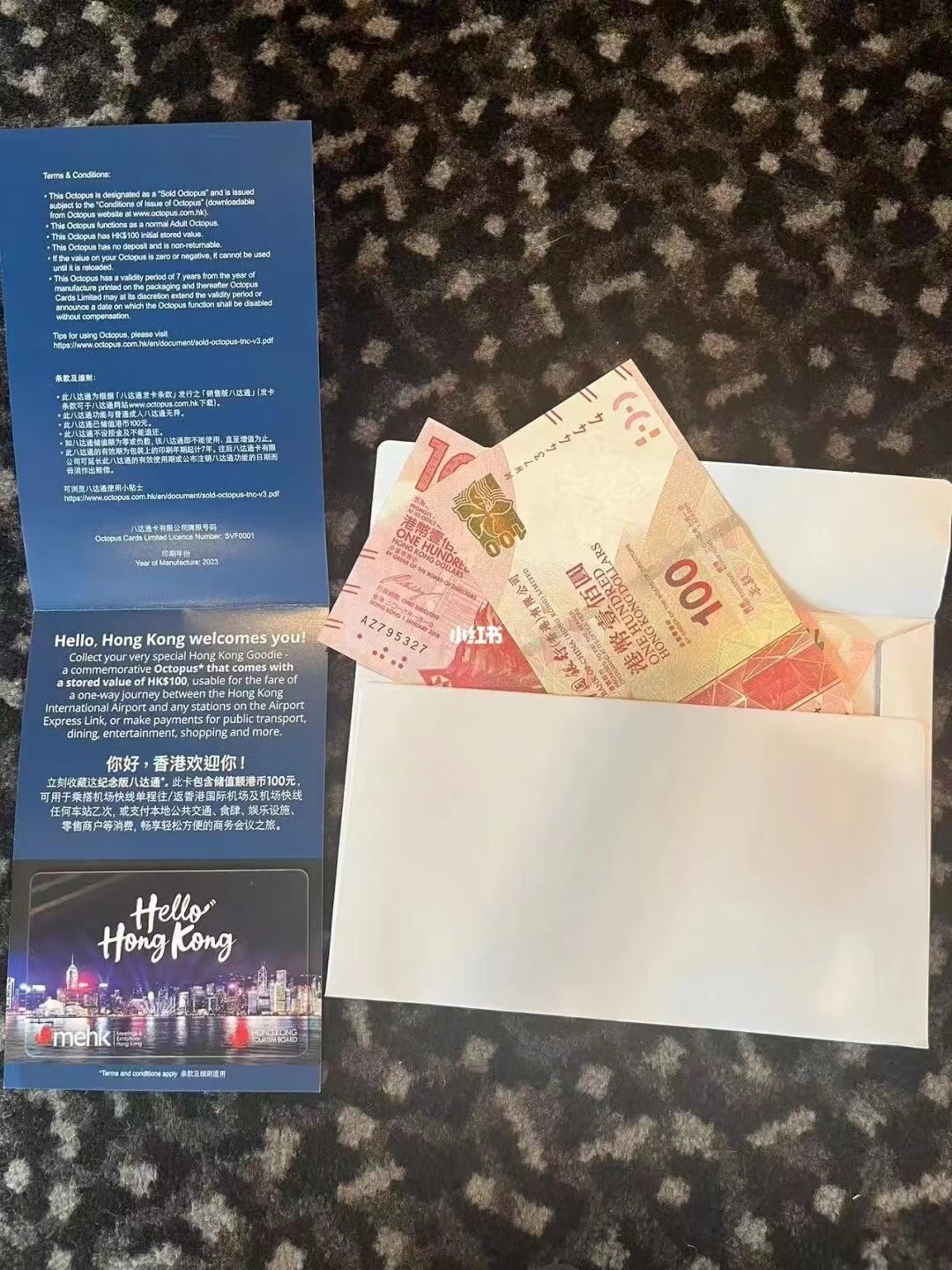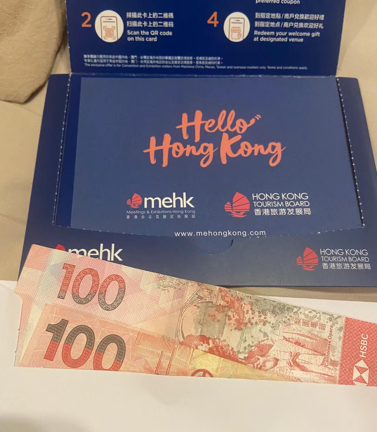 大公文匯全媒體報道,社交平台小紅書日前有多篇帖文,稱特區政府大派送,旅發局在會展設攤位,每人可領取200元現金加八達通。圖片可見,獲得的紀念版八達通卡印有「Hello Hong Kong」,左下角為旅發局旗下「香港會議及展覽拓展部(MEHK)」的標誌圖案,而包裝紙提醒卡內已儲值100港元,可用於公共交通、娛樂設施、零售及餐飲商戶等。至於兩張100港元則放在一個白色信封中,連同八達通儲值金額,合共送出300元。
