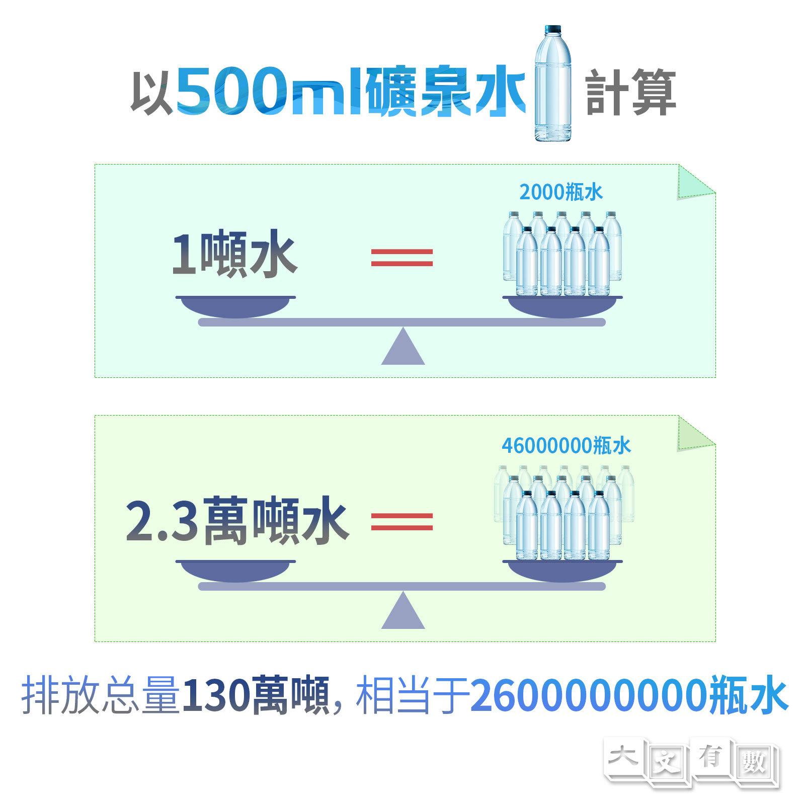 如果不算瓶子的重量,以500ml礦泉水計算,一噸水等於2000瓶水,2.3萬噸就是四千六百萬瓶水。排放總量130萬噸,相當於26億瓶水。