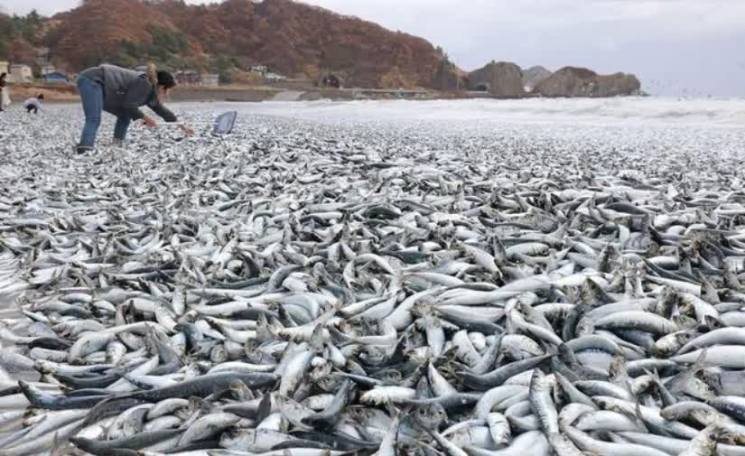 12月8日,日本北海道函館市海岸出現大量沙丁魚和鯖魚屍體,布滿海岸線約1.5公里,粗估死魚重達1000多噸。