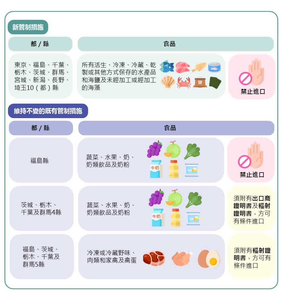 特區政府宣布從8月24日開始禁止源自東京、福島、千葉、栃木、茨城、群馬、宮城、新潟、長野和埼玉等10個都/縣的水產品進口,包括所有的活生、冷凍、冷藏、乾制或以其他方式保存的水產品、海鹽以及未加工或經加工的海草。