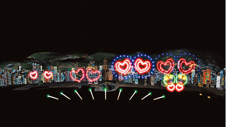 冬季再臨,又是新生命的循環,譜寫新傳奇。其中,繽紛煙花組成一對對「愛心」、「哈哈笑」圖案。