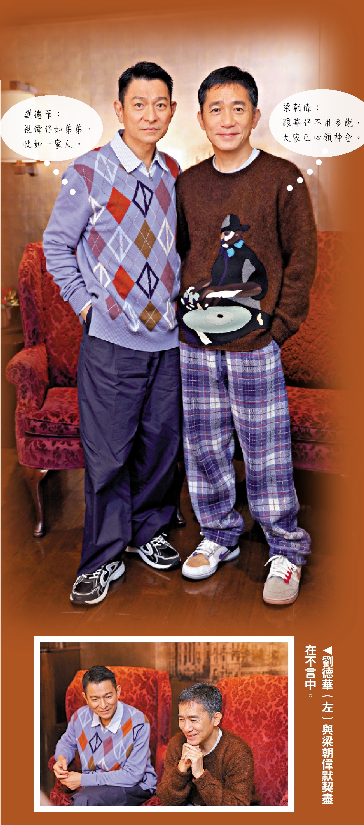 問到會否不時想當年?華仔笑言如果不是大家提起,他們不會想起。提到以前的難忘事,偉仔指最深印象是拍《鹿鼎記》,當時與華仔一齊開工近半年,雖然辛苦但很好玩。再問在演出上,二人有沒有一些習慣是沒變過的呢?偉仔說:「我相信所有演員都一樣,會做很多資料搜集,在設計如何表演上,是不會變的。唯一變的是大家成熟了,不論人生閱歷、個人經驗以及表演技巧方面。在表演上,會覺得對方的感情、眼神,豐富了好多。」