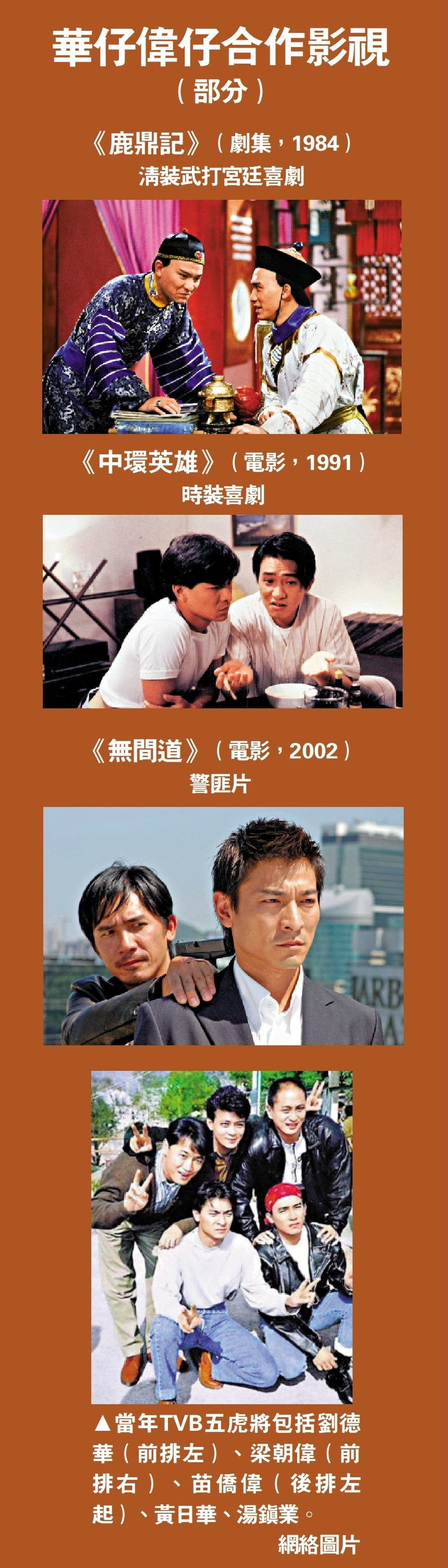 偉仔表示很多時跟華仔不用多說,大家已心領神會;可能因為年輕時一起拍攝《鹿鼎記》一劇,劇中二人是好朋友,當時已建立了很特別的關係,互相信任。現在再合作,已不用花時間去磨合。華仔說:「我們以前常常一齊做TVB台慶節目,我們五個人(合稱『五虎將』,其餘三虎是黃日華、湯鎮業、苗僑偉)都希望大家將各自的優點發揮,同時會幫大家隱藏缺點。以前做這些節目,很需要默契。」偉仔笑言,現在再看(早年的表演)會覺得好幼稚。