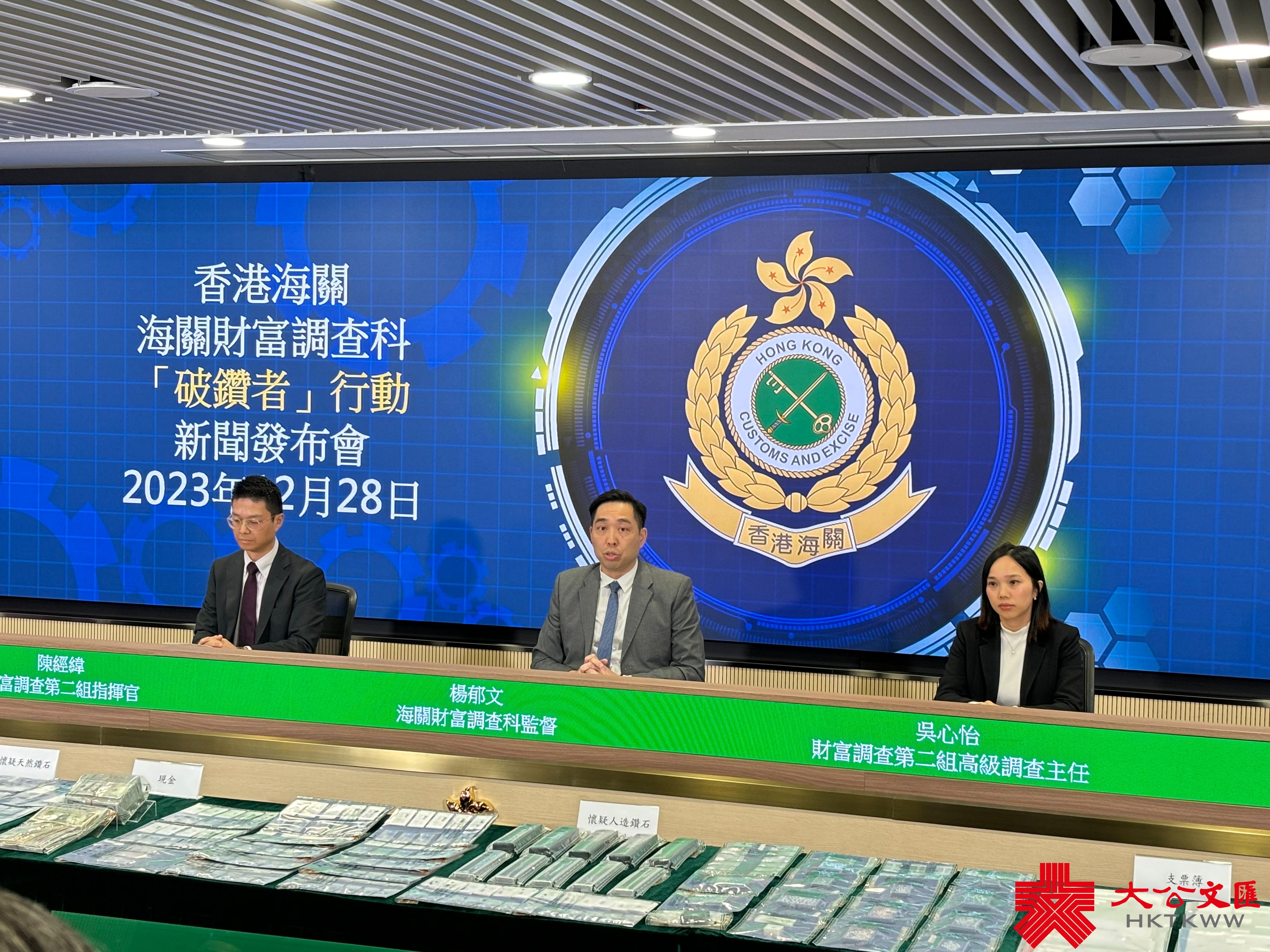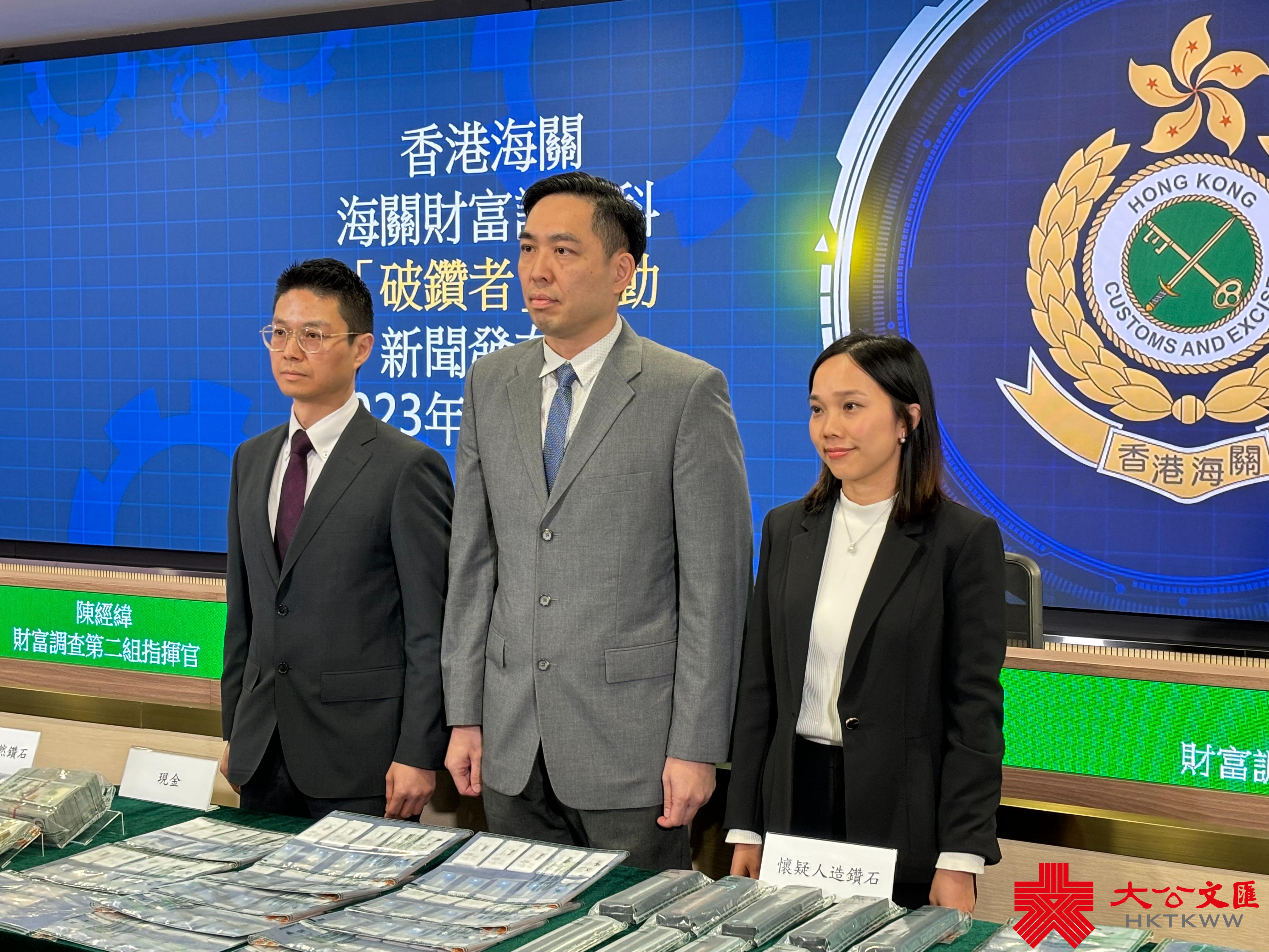 (大公文匯全媒體 記者 李九歌)香港海關「破鑽者」行動,首次偵破以跨國鑽石貿易進行清洗黑錢案件,涉款5億元,拘4人。海關財富調查科署理監督楊鬱文、財富調查第二組指揮官陳經緯及高級調查主任吳心怡今日(28日)出席記者會,講述案件及行動詳情。