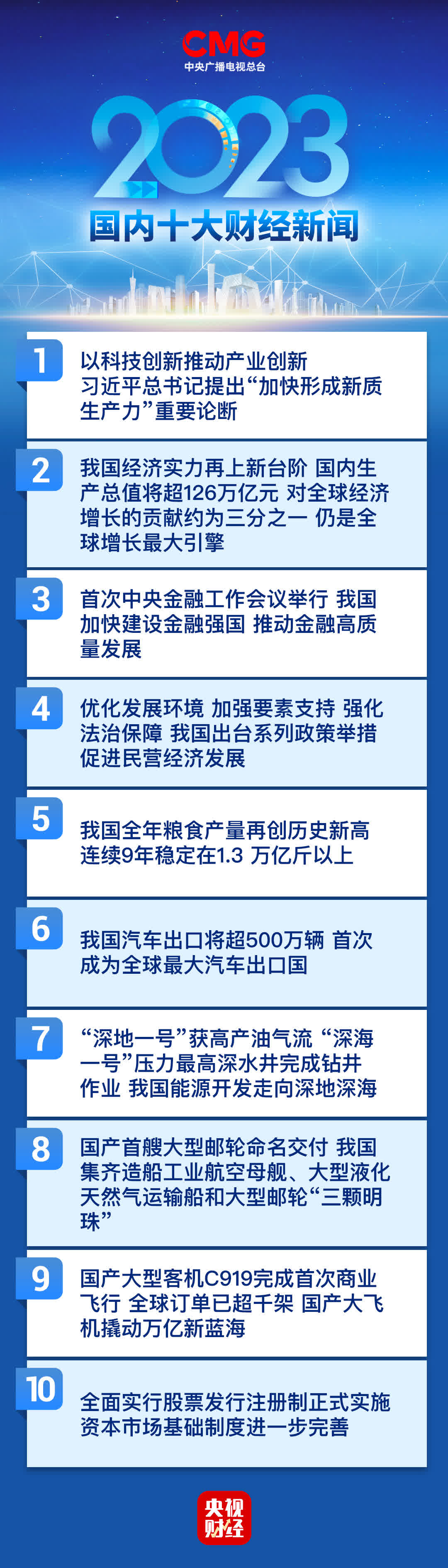 據央視新聞報道,12月28日,中央廣播電視總台評出2023年國內十大財經新聞、2023年國際十大財經新聞。