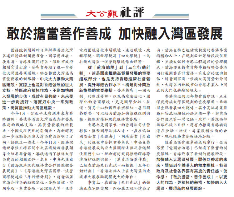 國務院新聞辦昨日舉辦粵港澳大灣區建設情況新聞發布會,國家發改委、廣東省、香港及澳門特區、深圳市政府相關官員出席,發布會介紹了進一步優化大灣區營商環境,聯合推動大灣區高質量發展的新舉措。中央大力推動大灣區建設,實際上也是對香港發展的巨大支持。特區政府積極作為,不斷加快融入發展的步伐,成效有目共睹,未來要進一步對接好、落實好中央一系列政策,高質量推動大灣區建設。