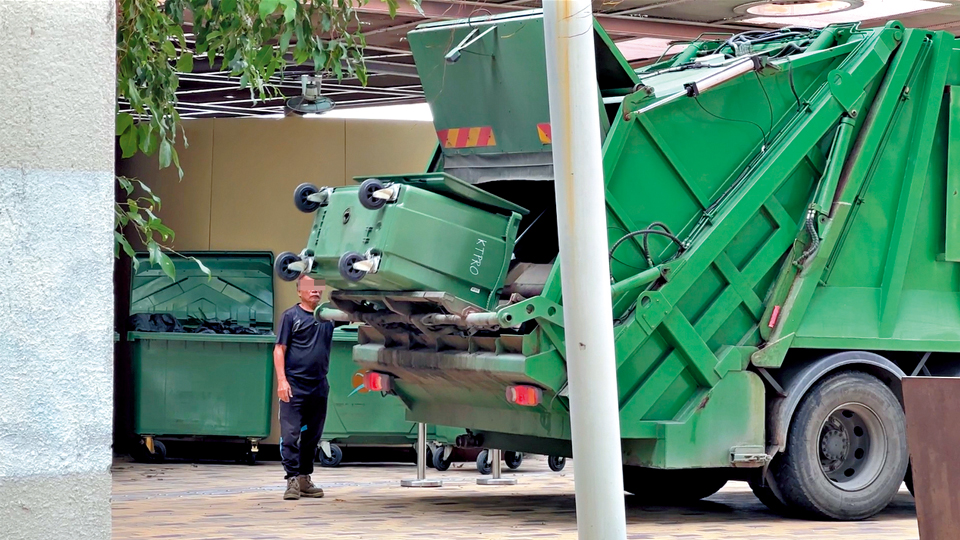 19日上午11時,綠色密封式垃圾車駛到公園的垃圾收集處,司機跳下車把綠色收集箱內的垃及倒進車斗。這些垃圾混着回收品,有廢紙、金屬,也有香蕉皮、廚餘等。待垃圾全數倒入,司機便驅車駛走。大公報記者駕車尾隨,見垃圾車駛到400米外海濱道公園,司機再落車把放在公園外五個大型收集箱內滿載的垃圾倒入車斗。如是者,垃圾車先後再到九龍灣公園、宏照道公屋地盤、水務署東區大樓旁草地、塘道遊樂場及三家村遊樂場收取垃圾。最終,垃圾車開到位於沙田石門的「沙田廢物轉運站」,收來的回收物和普通垃圾混在一起卸下。