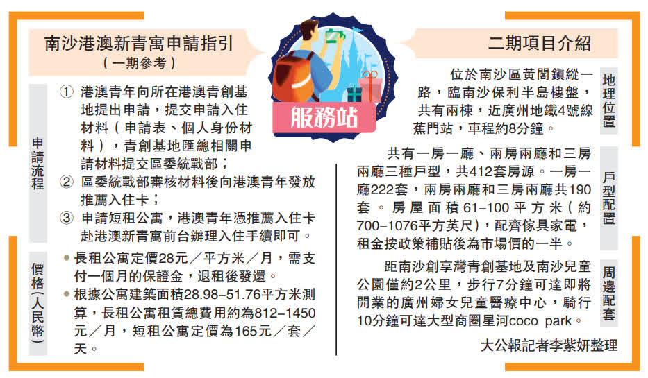 (大公報記者 李紫妍 廣州報道)28日,由南沙區區委統戰部、區住建局與南沙開建集團合力打造的港澳青年公寓品牌──「港澳新青寓(二期)」啟動運營。該項目二期位於南沙區黃閣鎮縱一路,周邊配套齊全。共有412套房源,面積介於61-100平方米(約700-1076平方英尺)之間,除一房一廳外,還提供適合家庭居住的兩房或三房兩廳共190套。房屋租金約為市場價的一半,如一房一廳戶型,補貼後房租僅需762.5元(人民幣)/月(約833港幣)。