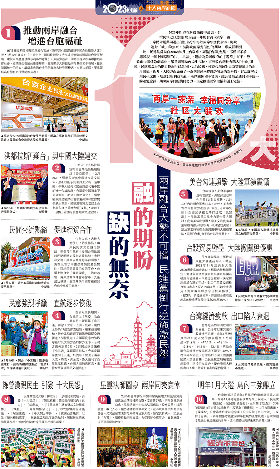 2023年即將在紛紛擾擾中過去,台灣民眾近日選出「缺」為這一年的台灣代表字,兩岸民眾則共同選出「融」為今年海峽兩岸年度代表字。海峽一邊對「缺」的無奈,與海峽兩岸對「融」的期盼,形成鮮明對比。民進黨當局自2016年5月上台以來,死抱「台獨」黨綱,不僅拒不承認體現一個中國原則的「九二共識」,還淪為美國政府的「遏華」打手,導致兩岸關係急劇惡化,嚴重影響島內民生福祉,更導致台灣社會陷入「十缺」困境。民進黨當局的倒行逆施早已激發巨大的民怨,使得台灣民眾更為嚮往融洽的兩岸關係。近月,大陸方面頒布了一系列推動兩岸融合發展的新舉措,有助紓解台灣民生之困、增進台胞利益福祉。兩岸關係和平發展、融合發展是通向和平統一的重要途徑。期盼兩岸同胞共同努力,堅定維護國家主權和領土完整。