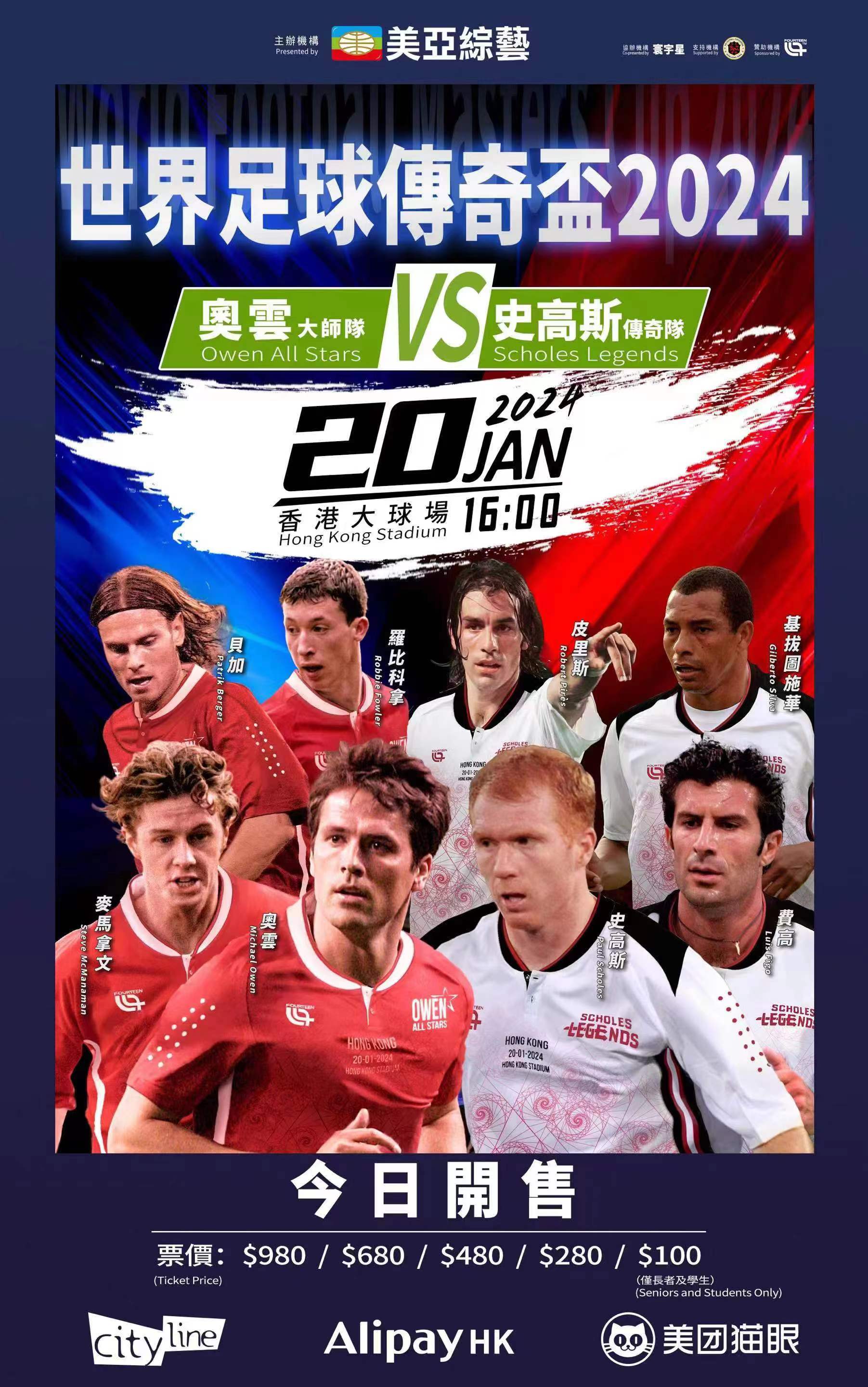 「世界足球傳奇盃2024」票價分港幣980元、680元、480元及280元,門票已於本月12日在AlipayHK、Cityline購票通、美團貓眼公開發售。