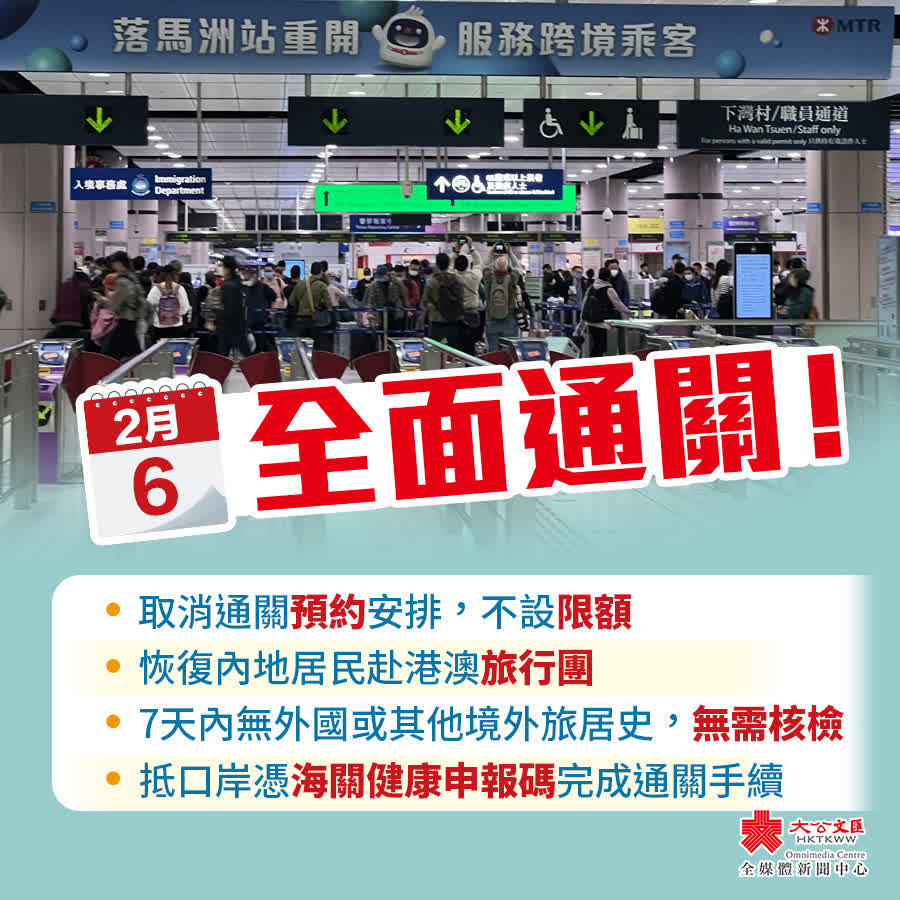 2月,全面通關。本港所有出入境口岸開放,不設人數安排,無須預約,取消核酸檢測,全面恢復內地與港澳人員往來。落馬洲口岸也恢復24小時通關服務,給內地與港澳人員往來提供更大便利。自此,本港掀起北上探親及旅行熱潮。