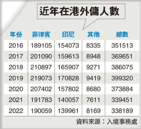 香港外傭的來源地非常廣泛,包括菲律賓、印尼、越南、柬埔寨等。統計處數據顯示,截至2022年底,香港有33.8萬名外籍家庭傭工,來自菲律賓的外傭人數最多,有逾19萬人,佔整體外傭56%;其次是印尼外傭,有近14萬人,佔比約41%;其餘來自其他地方的外傭只有8000多人,佔比約2%。