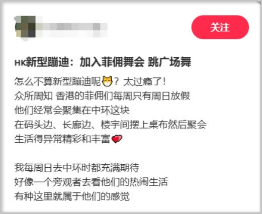 有網友表示,自己在5月份曾參加過一次菲傭在中環的聚會,那天是母親節,大家聚在一起,她和同學還被分到了食物和鮮花。她稱自己完全被她們那種歡快溫馨的氛圍感染了。