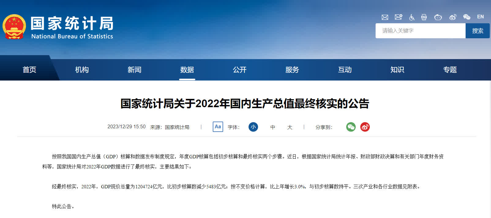 公告表示,按照我國國內生產總值(GDP)核算和數據發布制度規定,年度GDP核算包括初步核算和最終核實兩個步驟。近日,根據國家統計局統計年報、財政部財政決算和有關部門年度財務資料等,國家統計局對2022年GDP數據進行了最終核實,核實結果為2022年GDP現價總量為1204724億元,比初步核算數減少5483億元;按不變價格計算,比上年增長3.0%,與初步核算數持平。