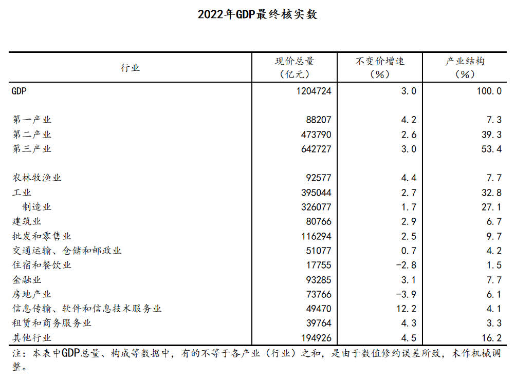 據新華社報道,國家統計局29日發布《國家統計局關於2022年國內生產總值最終核實的公告》(以下簡稱「公告」),公告稱,2022年,GDP現價總量為1204724億元,比初步核算數減少5483億元;按不變價格計算,比上年增長3.0%,與初步核算數持平。