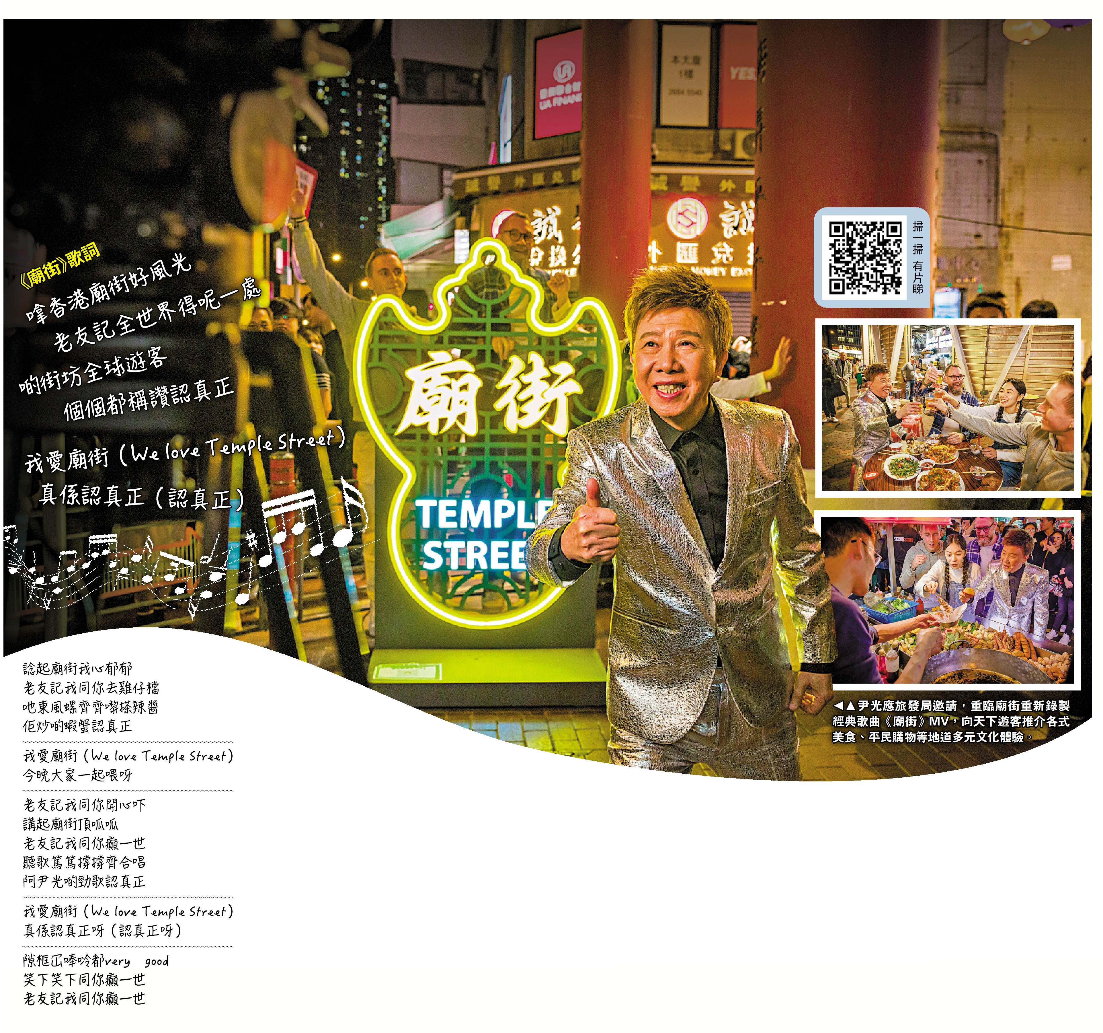 一代「廟街歌王」尹光近日應香港旅遊發展局邀請重臨舊地,重新錄製其經典歌曲《廟街》音樂短片(MV),一起唱好廟街、唱好香港,他誠意邀請大家到廟街感受舊情懷、新風貌。尹光昨日接受《大公報》訪問時表示,廟街具有香港地道特色,人人都很熱情,他希望全天下遊客到來廟街遊玩體驗!