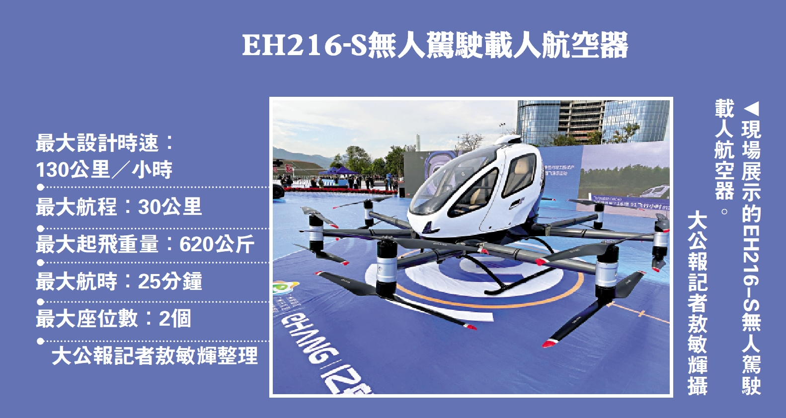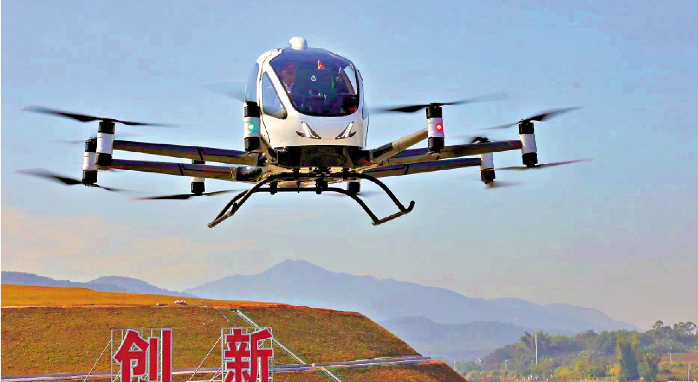 (大公報 記者 敖敏輝 廣州報道)12月28日11時,由億航智能自主研發的EH216-S無人駕駛載人航空器,搭載乘客從中新廣州知識城九龍湖廣場起飛,環湖飛行一圈後,穩穩降落,完成了全球商業首飛演示,獲首飛乘客盛讚飛行過程噪音小,比民航飛機更穩定。當天,這款載人無人機交付給廣州一家企業,最快明年一季度將投入空中通勤、空中文旅等常態化運營,目前已開闢測試了5條航線,「空中的士」即將成為現實。