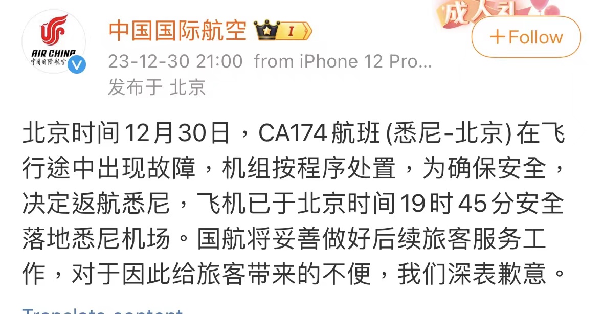 大公文匯全媒體報道,中國國際航空表示,北京時間12月30日,CA174航班(悉尼-北京)在飛行途中出現故障,機組按程序處置,為確保安全,決定返航悉尼,飛機已於北京時間19時45分安全落地悉尼機場。