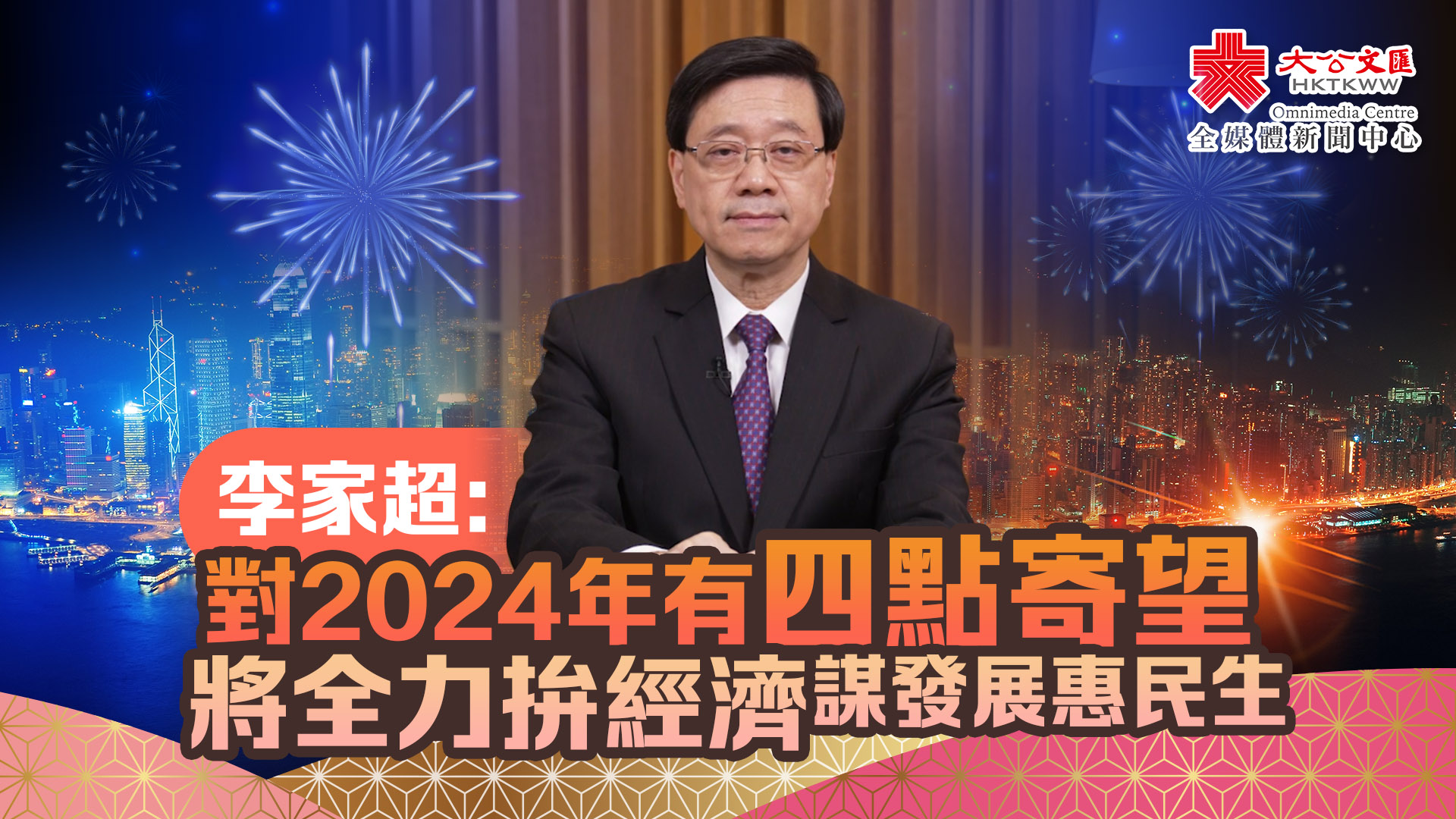 大公文匯網報道,香港特別行政區行政長官李家超今日(12月31日)在《紫荊》雜誌發表文章,他表示,如果說,2023年是疫後全面復常、急起直追的一年;那麼,2024年將是全力拚經濟、加速謀發展、積極惠民生的一年。展望新的一年,李家超有四點寄望:堅持貫徹 「一國兩制」,持續維護國家安全;堅持完善治理體系,持續提升治理效能;堅持排解民生憂難,持續增強發展動能;堅持鞏固既有優勢,持續融入國家發展。以下為文章全文: