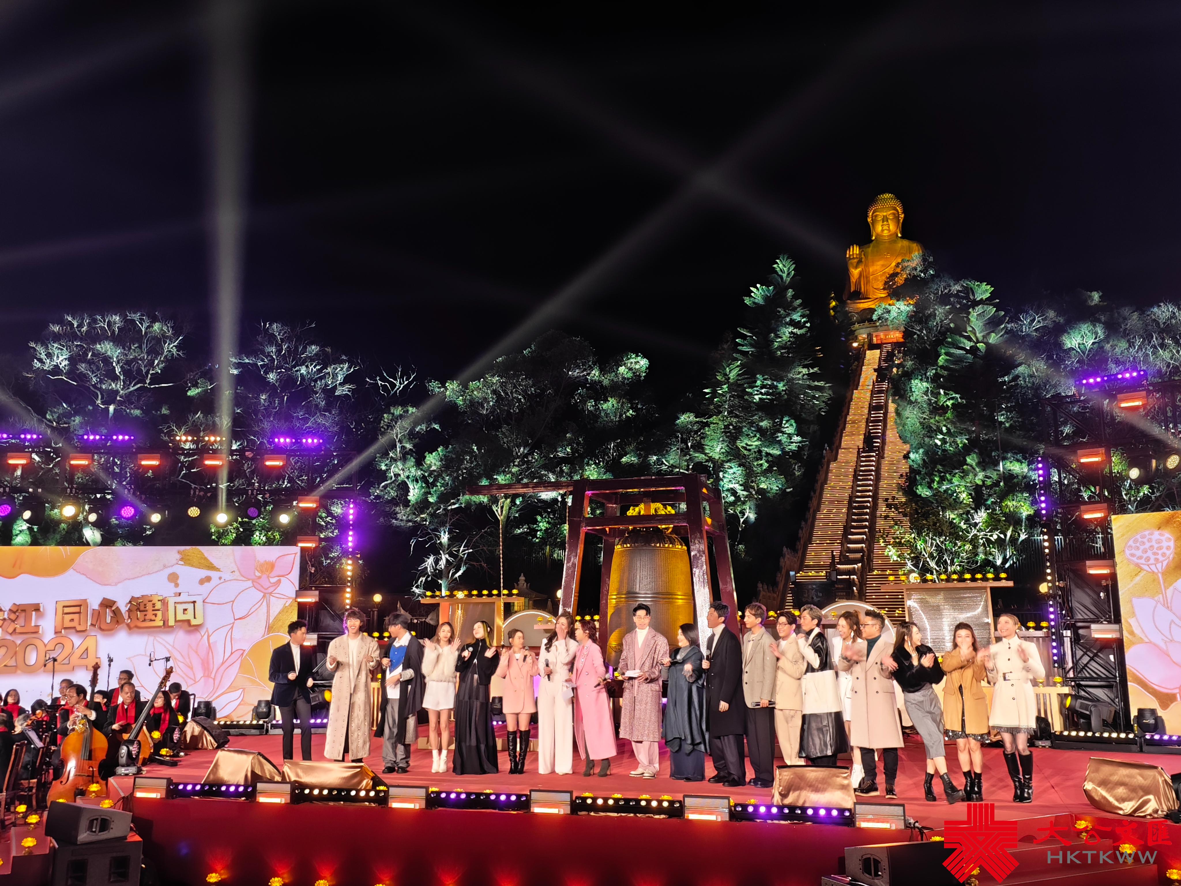 其後,王馨平、譚俊彥、谷婭溦等歌手藝員聯同多個專業演藝團體,獻上連場音樂盛宴,再加上天壇大佛的鐘聲、蓮花燈海和超過350架無人機大匯演,為香港以至全球觀眾送上2024年元旦最美妙的祝福,祈求2024年事事順遂,有更美好的新一年。