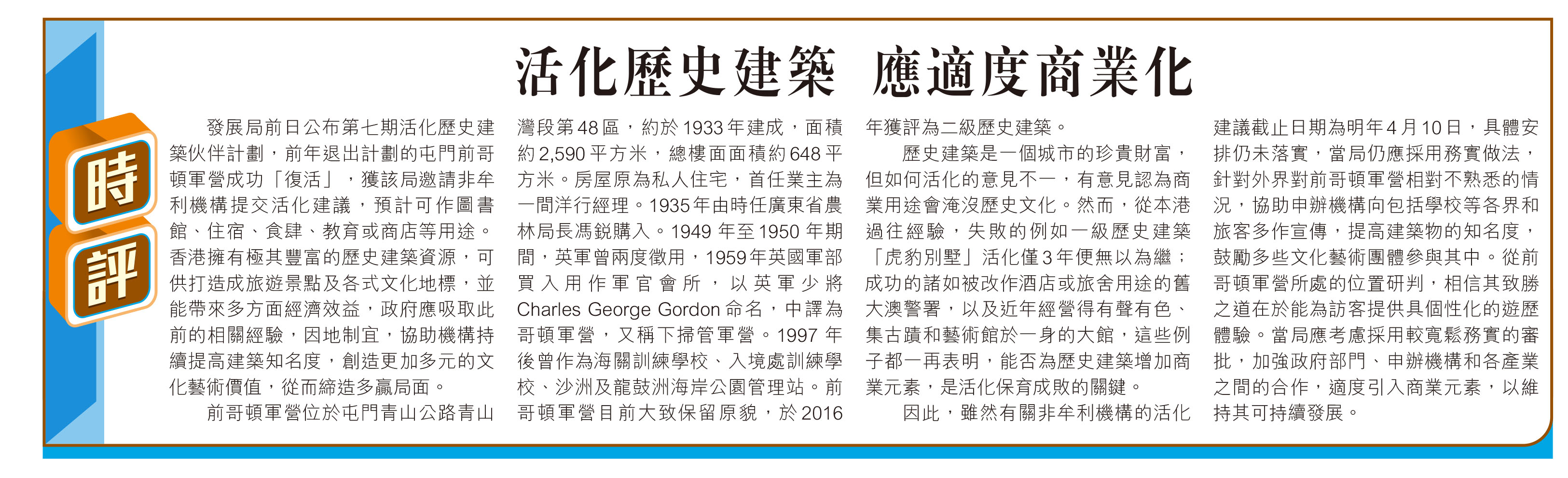 發展局前日公布第七期活化歷史建築伙伴計劃,前年退出計劃的屯門前哥頓軍營成功「復活」,獲該局邀請非牟利機構提交活化建議,預計可作圖書館、住宿、食肆、教育或商店等用途。香港擁有極其豐富的歷史建築資源,可供打造成旅遊景點及各式文化地標,並能帶來多方面經濟效益,政府應吸取此前的相關經驗,因地制宜,協助機構持續提高建築知名度,創造更加多元的文化藝術價值,從而締造多贏局面。