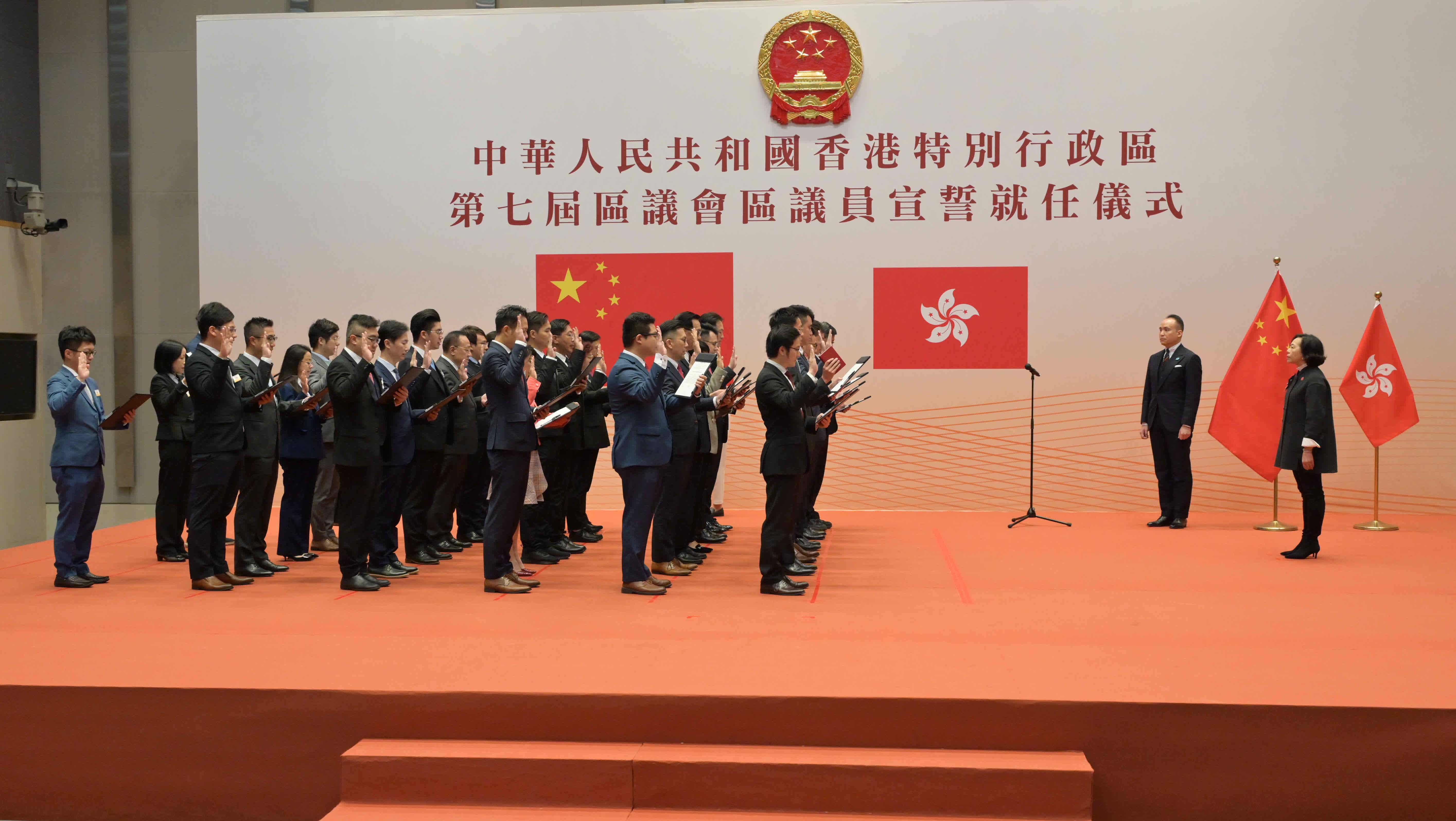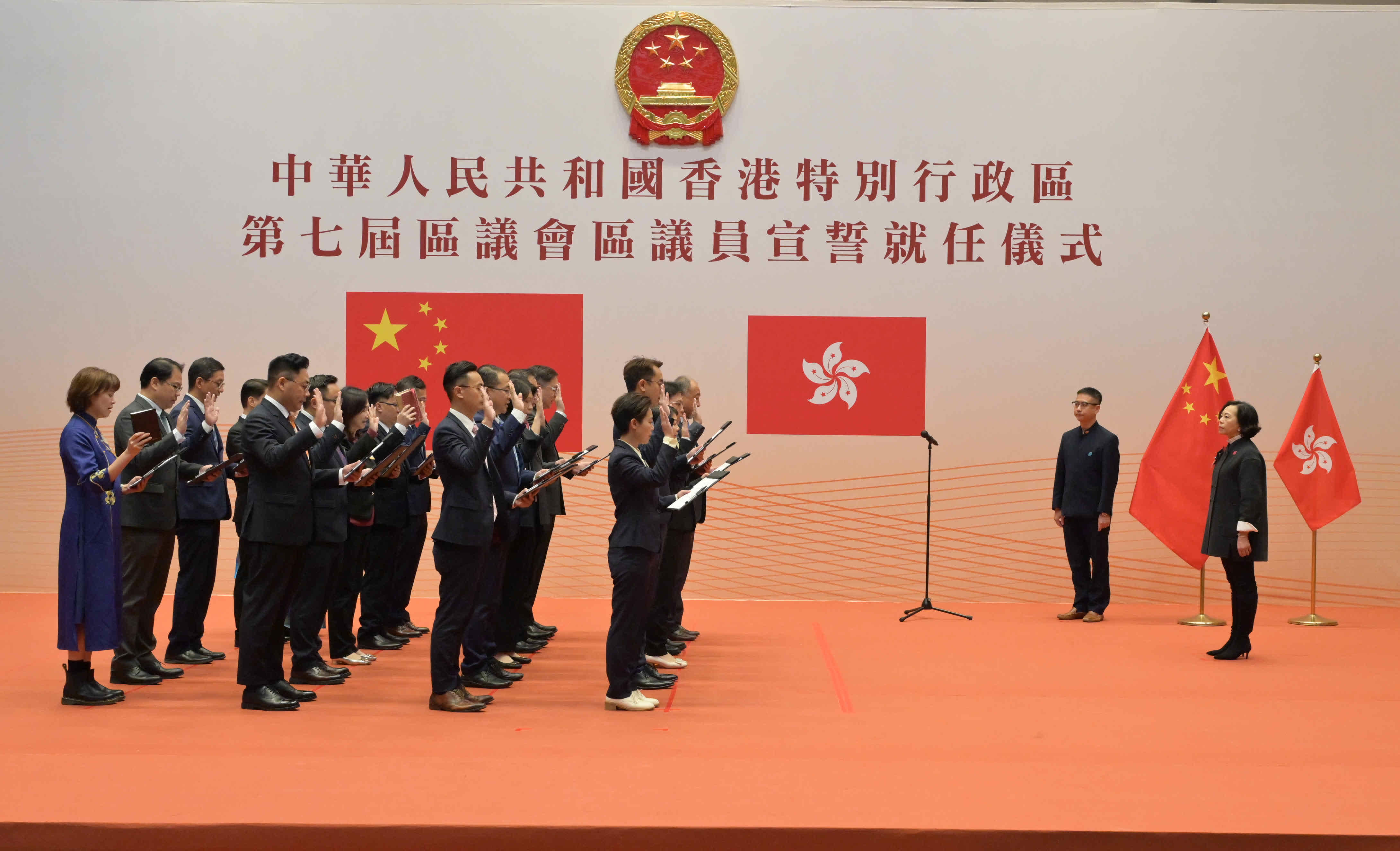 全體470位區議員按《宣誓及聲明條例》,宣誓擁護基本法,效忠中華人民共和國香港特別行政區,由獲行政長官授權的民政及青年事務局局長麥美娟監誓。