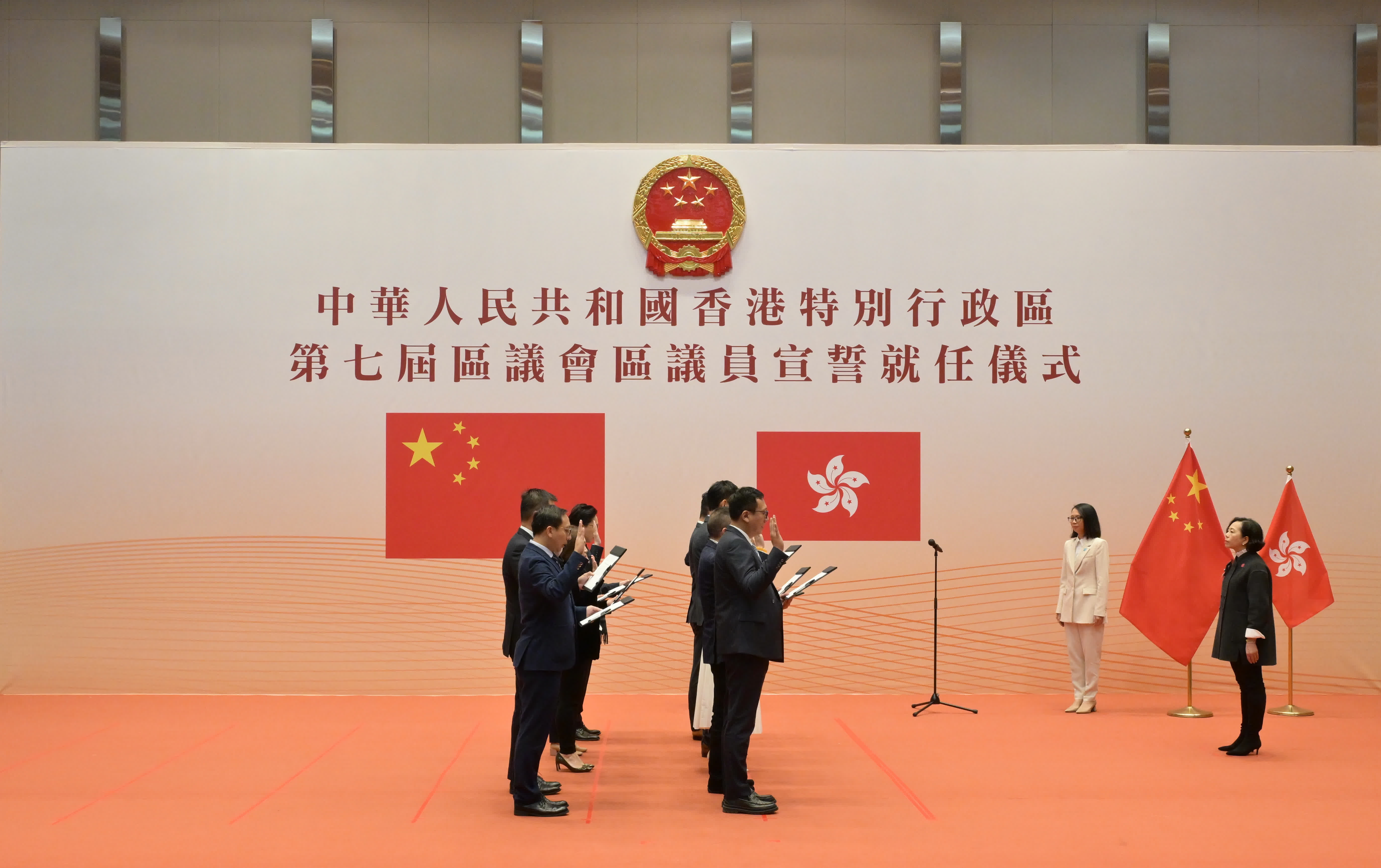 大公文匯全媒體報道,政府今日(2024年1月1日)在政府總部會議廳舉行第七屆區議會區議員宣誓就任儀式,行政長官李家超出席儀式。根據全國人民代表大會常務委員會關於基本法第一百零四條的解釋所訂下的原則及相關的法律規定,監誓人確定全體470位區議員的宣誓為有效宣誓。