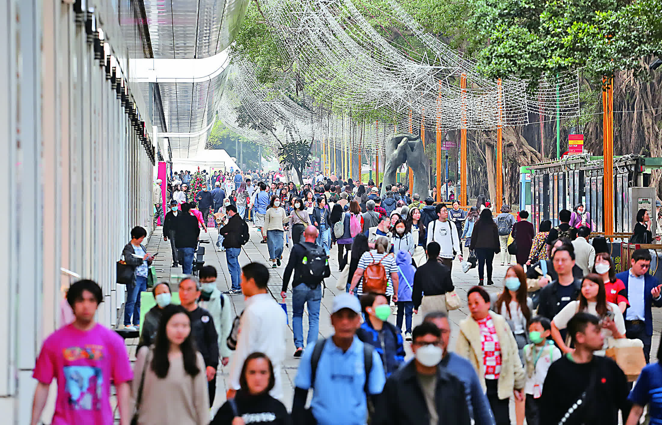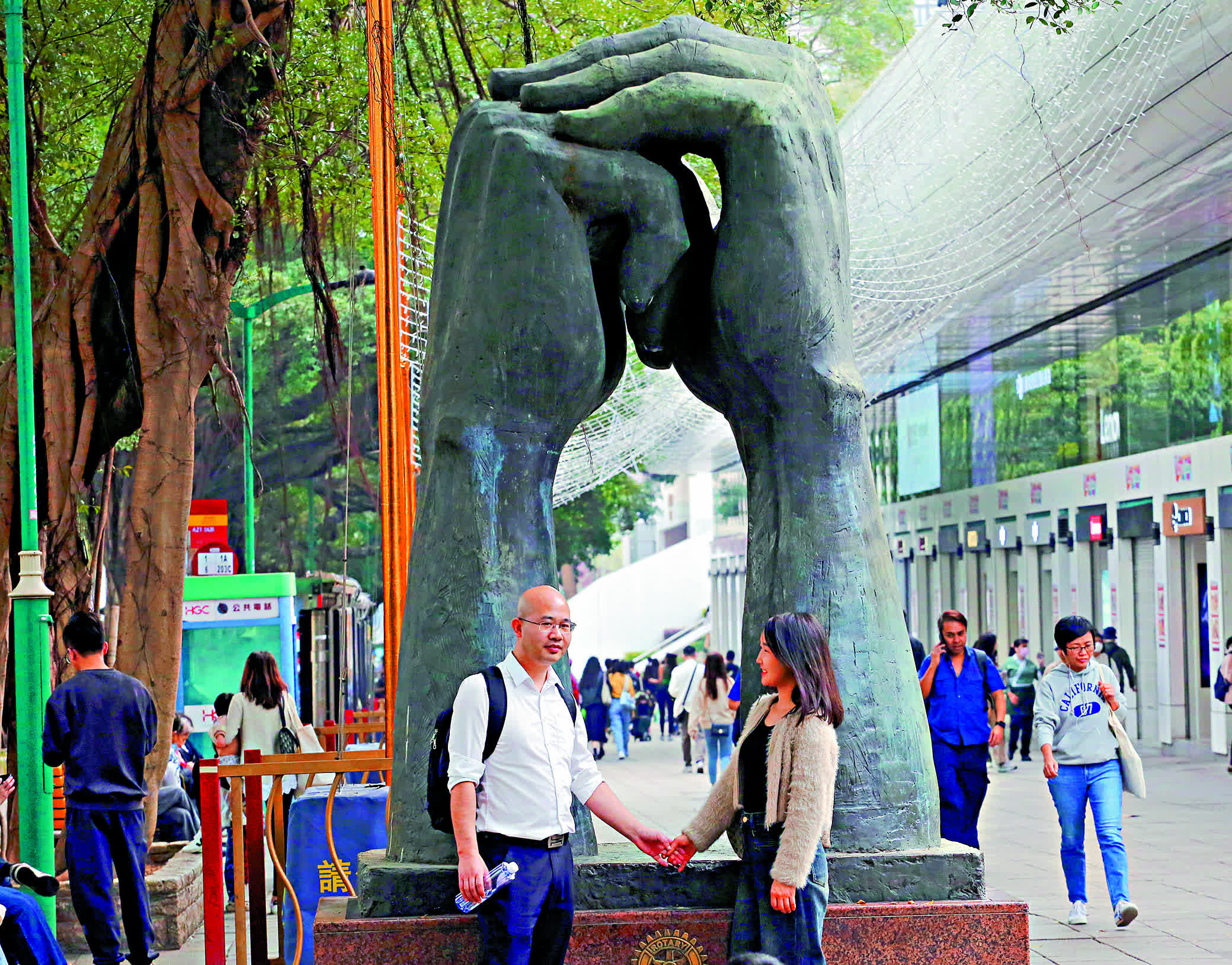 首次來港的旅客徐小姐對《請》駐足欣賞,並拍照留念。她讚揚香港市民有素質,若再舉辦「禮貌運動」,更可以提升吸引力。