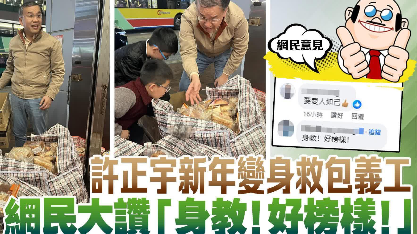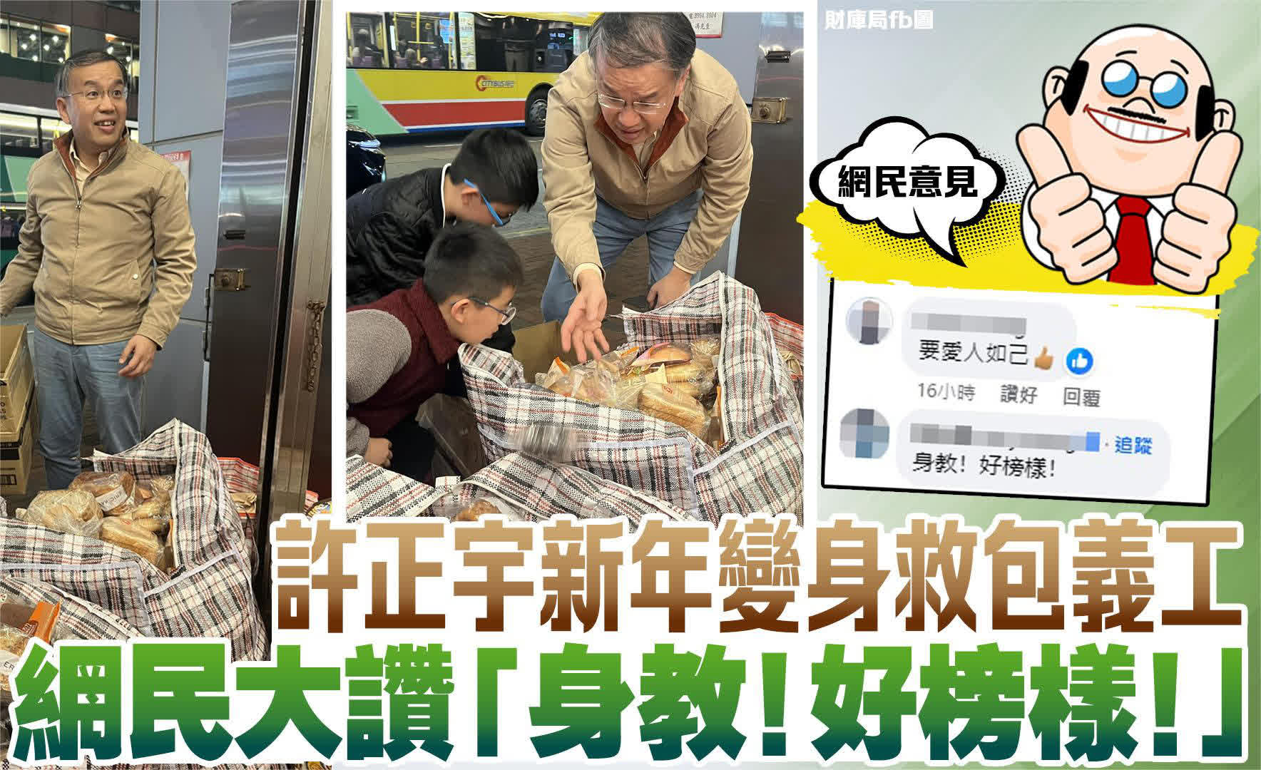 財庫局在社交專頁以「新年第一天從助人開始」為題發文,上載了兩張相片,見到許正宇正收集大量麵包,身旁有兩名男孩,已將多個紅白藍袋載得滿滿。