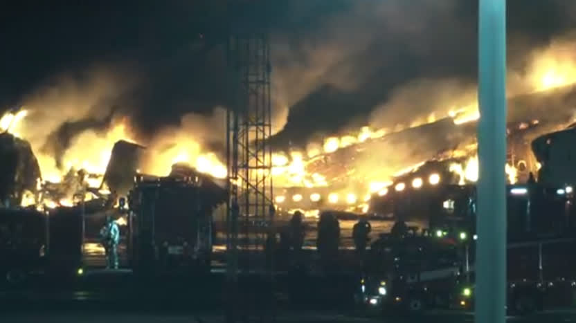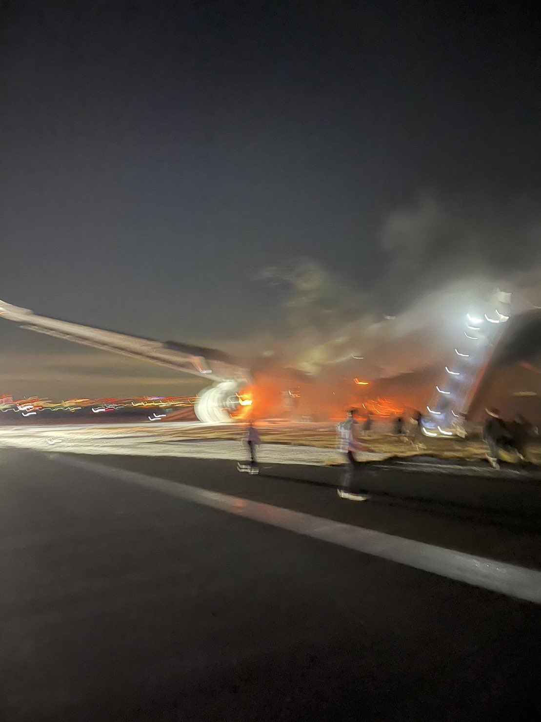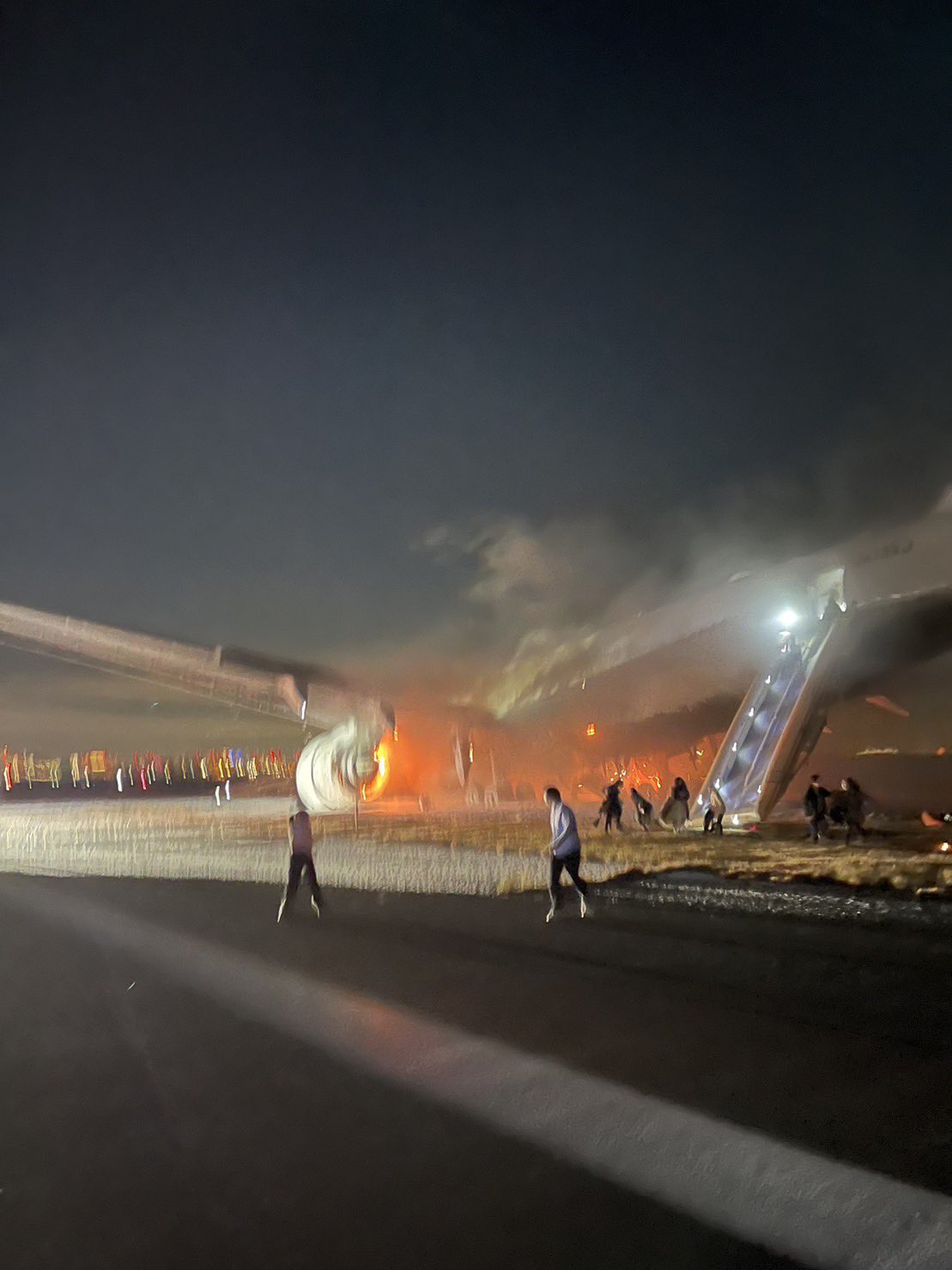 據網傳現場畫面,有大量乘客瀡逃生梯逃生。據日媒直播畫面可見,飛機近乎焚毀,多輛消防車正進行滅火工作。