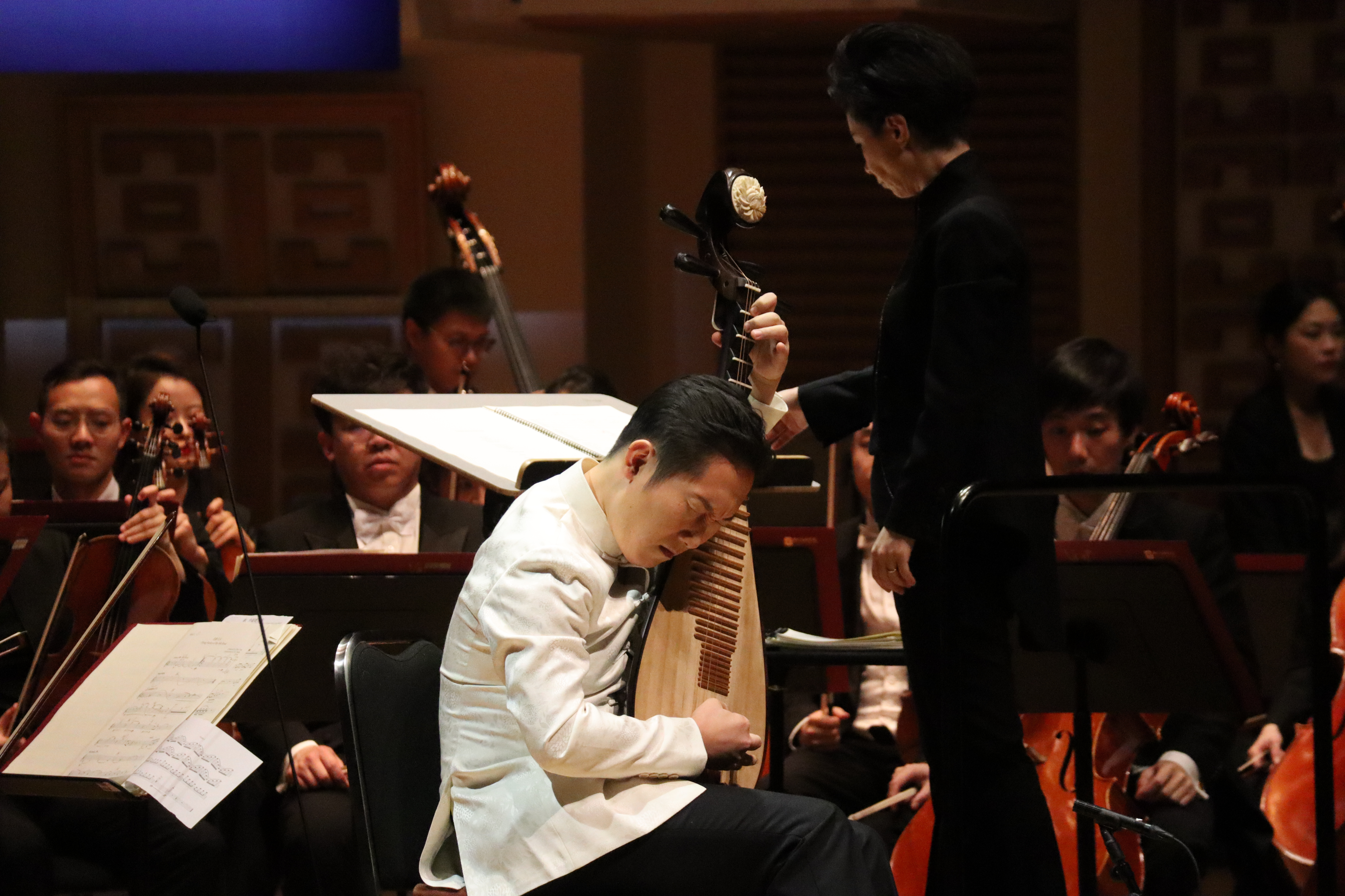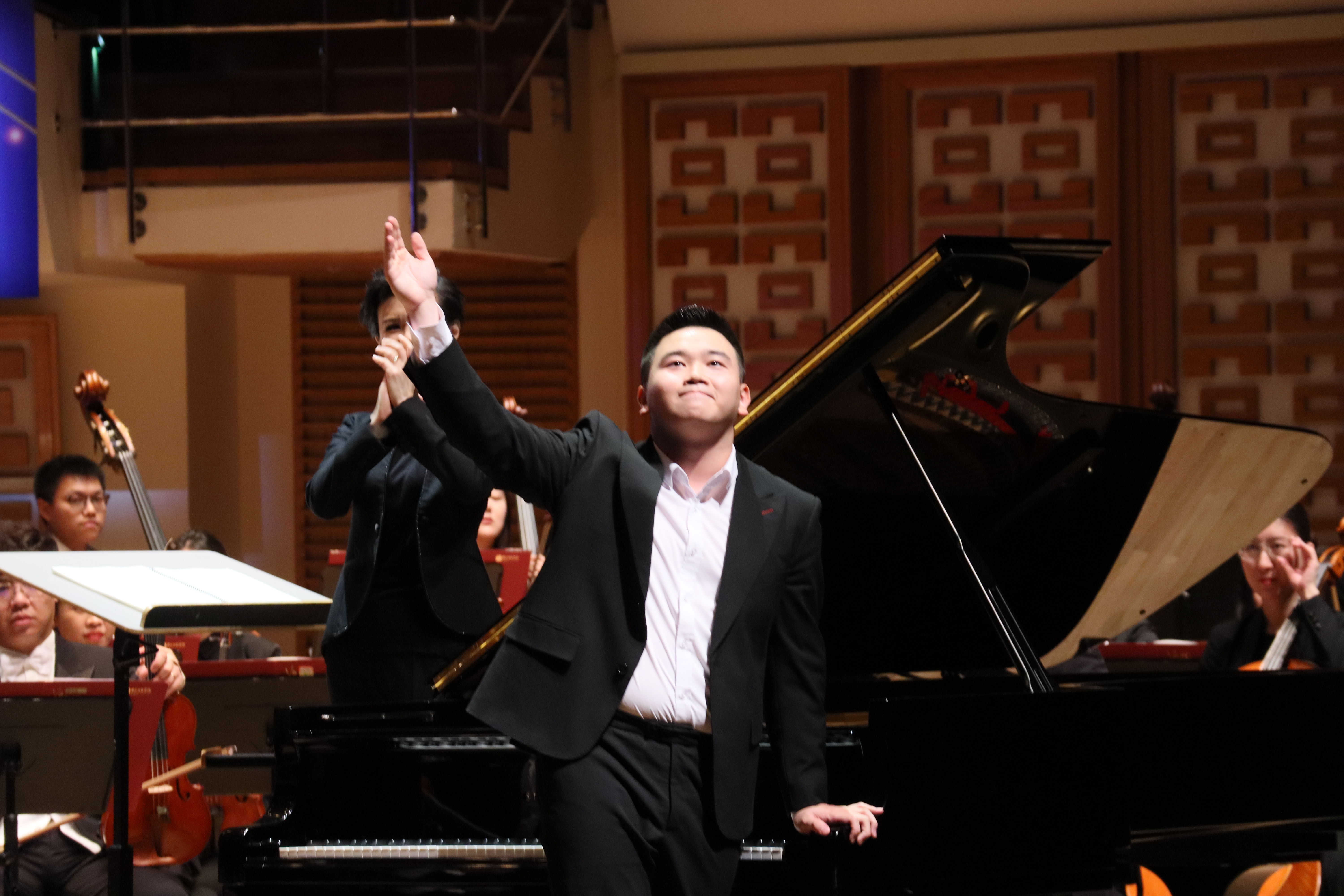音樂會下半場,鋼琴新星李哲翔率先登台,以精湛的演奏技藝為觀眾奉獻了柴可夫斯基《第一鋼琴協奏曲》第三樂章,鋼琴與樂隊的互動配合,節奏和旋律的不斷變化,盡展經典魅力。隨後,第12屆中國音樂金鐘獎獲得者、青年小提琴演奏家黨華莉以一首非常有表現力和技巧性的《卡門幻想曲》,充分展示了演奏技巧和音樂感染力;男高音歌唱家莫華倫首先帶來意大利經典歌曲《我的太陽》,接下來一曲粵語版《萬里長城永不倒》,讓觀眾在激昂振奮人心的旋律中感受到中國人民不屈不撓、堅韌不拔的精神;男中音歌唱家廖昌永以嫻熟高超的演唱技巧和寬厚明亮、富有感染力的嗓音,為觀眾演唱了兩首中外經典作品,一首是充滿活力和幽默感的歌劇《塞維利亞的理髮師》選段「快給大忙人讓路」,另一首是具有濃郁民族風格的歌曲《父親的草原母親的河》,贏得現場觀眾陣陣熱烈掌聲。