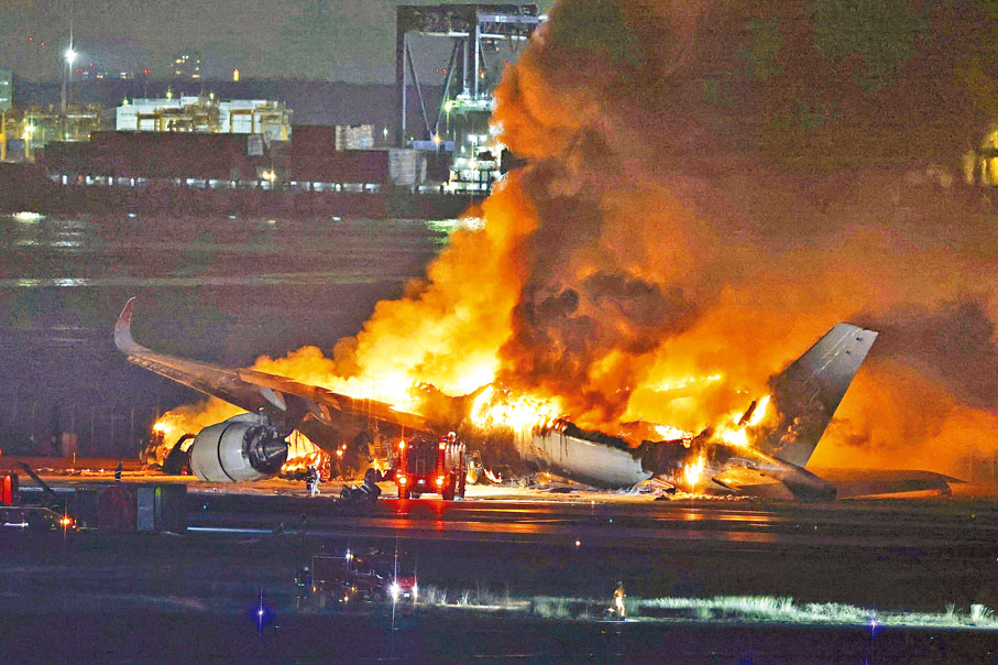 香港文匯報報道,日本東京羽田機場周二(1月2日)下午發生撞機事故,一架日本航空 (JAL)客機與日本海上保安廳一架飛機相撞,兩架飛機都起火燃燒及傳出爆炸聲。日航確認機上合共379人全數順利逃生,其中17人受傷。海上保安廳飛機搭載的6人則有5人死亡、逃出的機長重傷。事發後羽田機場全面關閉,當天幾乎所有航班取消。初步調查顯示日航客機準備降落時,與正準備起飛的海上保安廳飛機相撞,最終釀成猛烈大火。