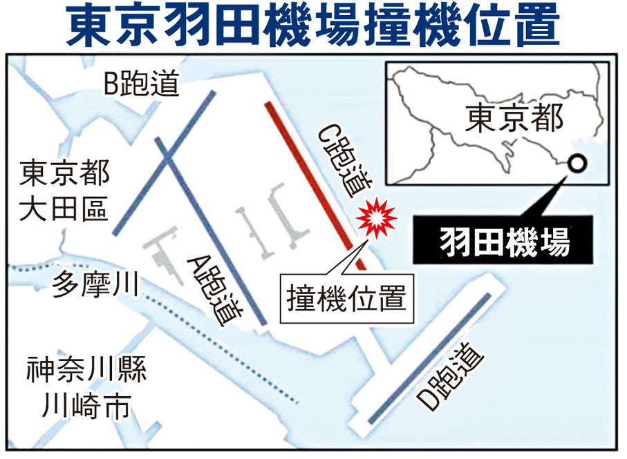 日本國土交通省東京機場事務所表示,羽田機場當日多數航班取消。由於羽田機場發生事故,原定抵達該機場的至少18個航班,改在東京成田機場降落。