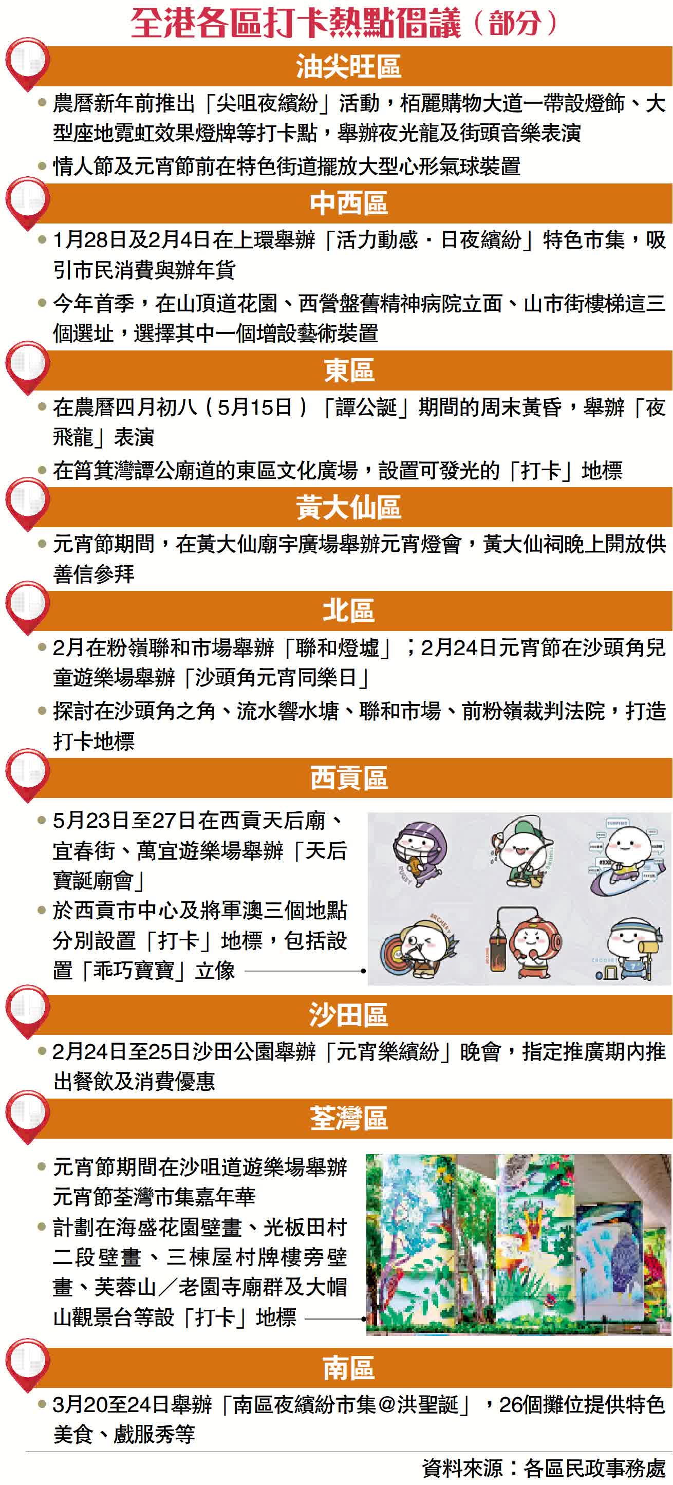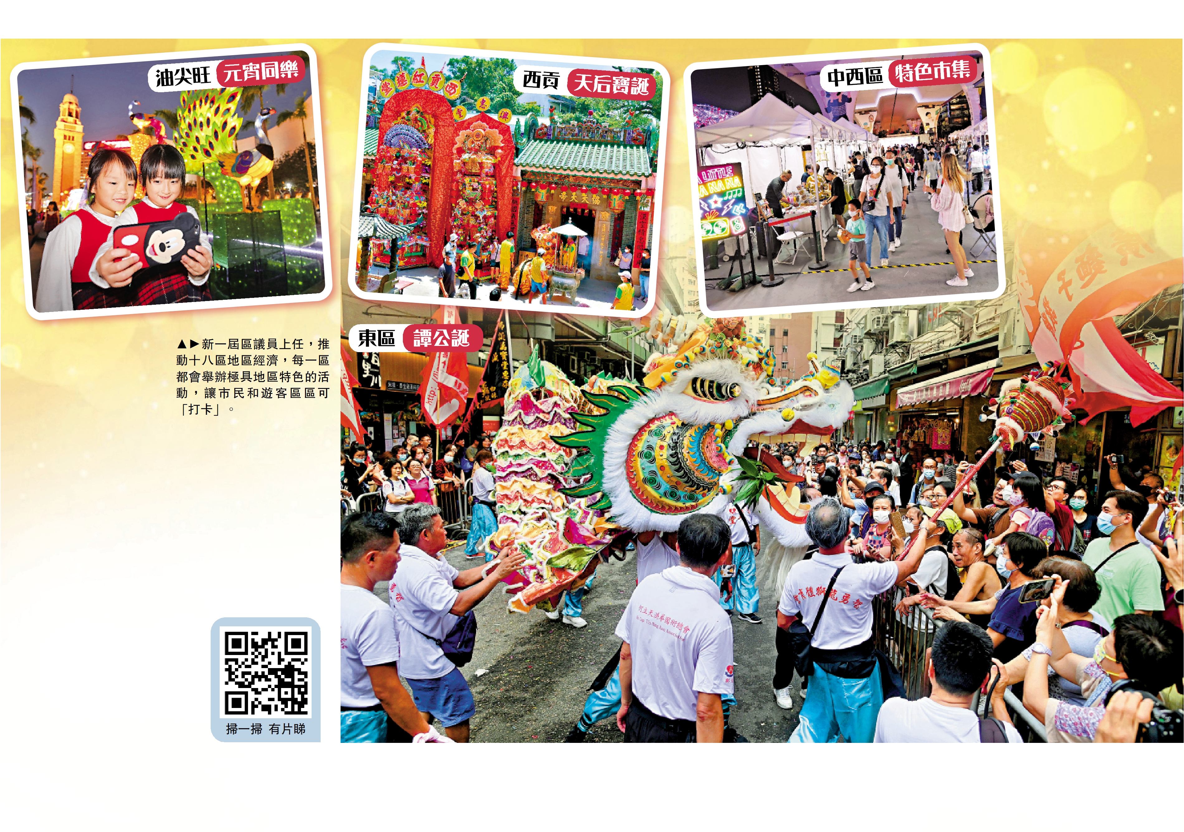 籌辦推動地區經濟發展的活動、設置富有地區特色的「打卡」地標,成為各區議會熱門議題,至少有九區已提出具體建議,透過舉辦新春市集、嘉年華、元宵同樂日等活動,展現地區文化傳統與特色,例如油尖旺區計劃在新春前推出「尖咀夜繽紛」,設大型霓虹效果燈牌、夜光許願樹等;東區計劃在五月「譚公誕」期間舉辦「夜飛龍」表演,西貢計劃在五月舉行天后寶誕市集等,節慶活動浪接浪,加上各區「打卡」地標,有望令香港在2024年全城興旺起來!