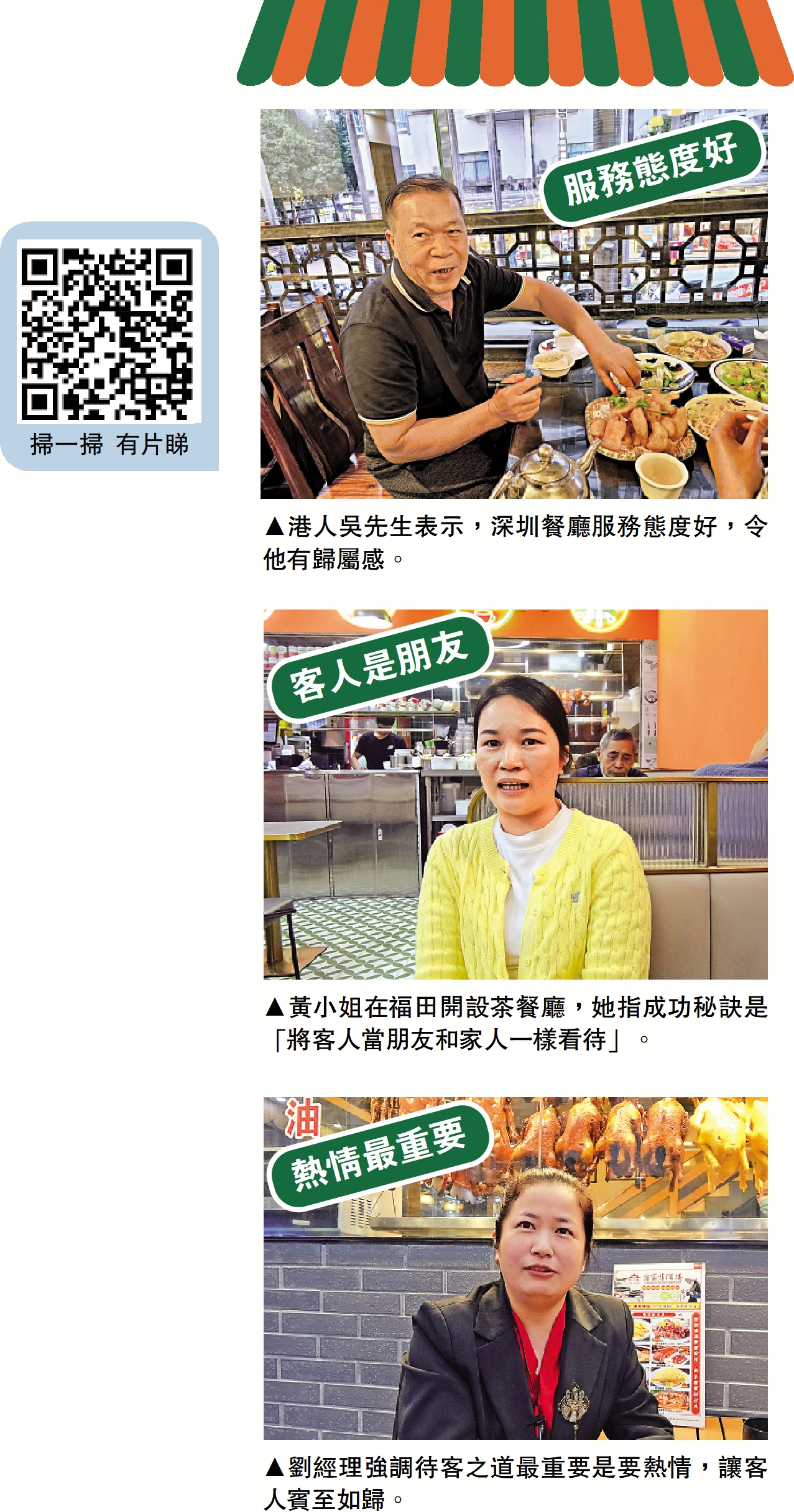 為何有那麼多港人到來光顧?餐廳劉經理表示,這裏除了靠近福田口岸、食物新鮮地道、價錢經濟實惠外,餐廳的服務也很重要。她強調,熱情是餐飲業最重要的待客之道,讓客人有賓至如歸的感覺,「首先是客人入店時要有歡迎聲,離開要有送客聲,而餐中服務最重要的是,客人有要求時,要即刻舉手回應,如果不是即時回應,客人就不知道你有沒有留意到他的訴求。否則,即使你做了,客人也不會知道。」