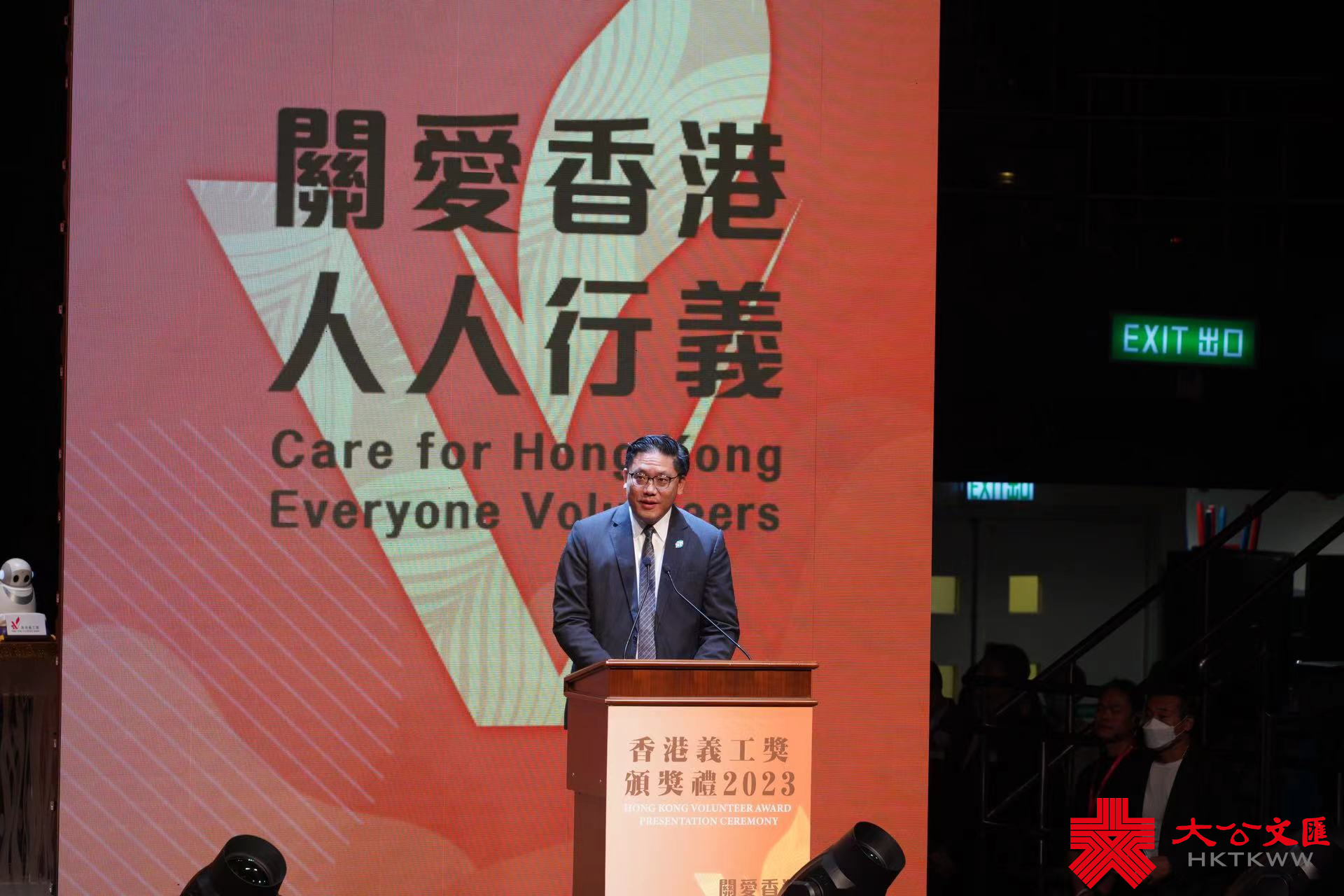民政及青年事務局副局長梁宏正在致辭時表示,得獎者來自社會各界,樂見更多市民大眾成為義工服務社會,大家所展現的善行善心值得肯定。政府一直致力推動和鼓勵社會各界參與義務工作,香港義工獎響應政府政策,鼓勵更多市民特別是青年參與義務工作,共建關愛共融社會。他說,青年人是社會未來的主人公,在着眼自身發展的同時貢獻國家、服務社會,在參與義工服務的過程中可以培育對社會的責任感、歸屬感和主人翁意識,從中構建積極正向的人生觀,接觸社會不同界別的人,學習在課堂外的知識和技巧,擴寬個人和社交網絡。