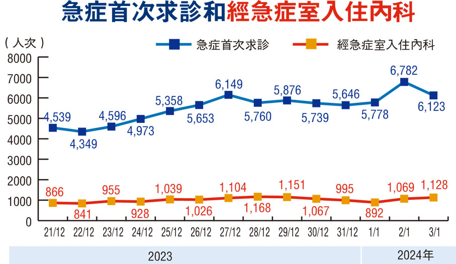 長假期過後,流感和上呼吸道感染疾病肆虐,醫管局總行政經理李立業表示,上月22日起已達「服務需求高峰期」,急症室首次求診人數和內科入院人次均有所上升,長假期後升幅持續。現時內科病床使用率由96%升至超過115%,而兒科病床使用率約75%到90%。他指病床使用率處於相對較高水平,會「有一定壓力」,當局將嚴陣以待,採取階段性應變措施,為市民提供適切治療。