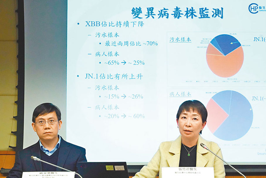 張竹君說,JN.1變異株感染比例逐步上升,在污水監測樣本中該變異株佔26%,病人樣本佔六成,預料有機會取代XBB成為香港主流的新冠變異株。她指出,JN.1已在全球多處傳播,有較強傳播力,但未有報告顯示JN.1比其他變異株有較強殺傷力,XBB疫苗亦對其有效。