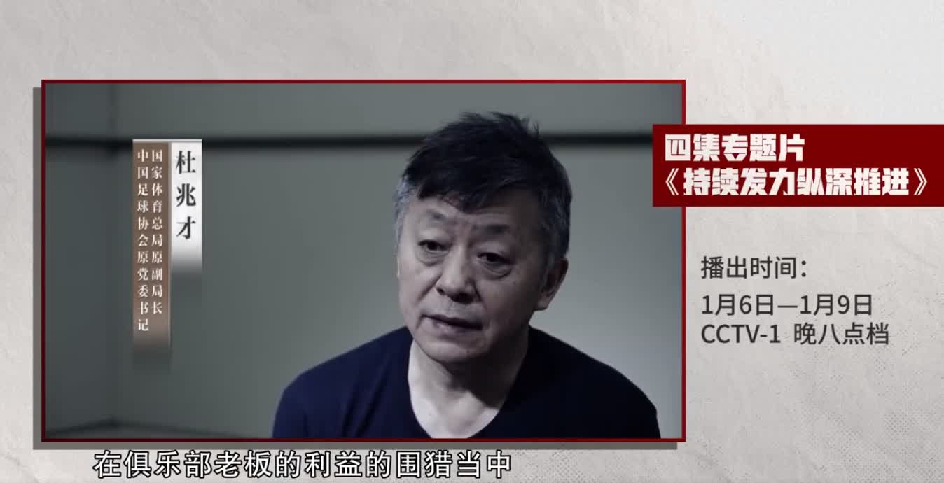 專題片中,將披露足球領域腐敗案細節。國家體育總局原副局長、中國足球協會原黨委書記杜兆才、中國足協原主席陳戌源、國足原主教練李鐵在鏡頭前懺悔。