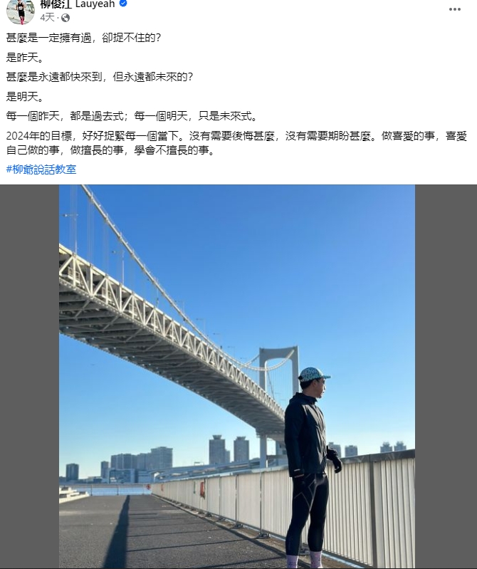 翻查柳俊江近日在社交平台的發文,可見他於1月1日元旦日發布一篇帖文,講述其新一年的目標。他表示:「什麼是一定擁有過,卻捉不住的?是昨天。什麼是永遠都快來到,但永遠都未來的?是明天。每一個昨天,都是過去式;每一個明天,只是未來式。」而其2024年目標,是「好好捉緊每一個當下。」從其文字看到,他對新一年的計劃是做自己喜愛的事及繼續學習,未見透露任何輕生的念頭。