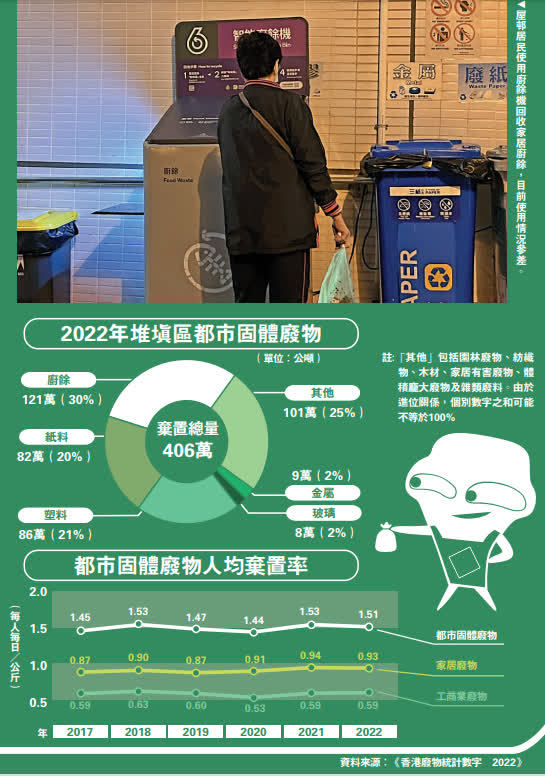 數據顯示,2022年棄置於堆填區的都市固體廢物中,廚餘佔30%,其次是廢塑膠及廢紙,分別佔21%及20%,與前一年比重相若。回收率由前一年的31%,升1個百分點,至2022年32%。其中回收作本地循環再造的都市固體廢物量約42萬公噸,按年增加超過五成,增長主要由塑膠物料及含鐵金屬的本地循環再造所帶動。不過,數字與《資源循環藍圖2013-2022》的目標,即都市固體廢物人均棄置量降至0.8公斤或以下、回收率升至55%,仍有較大距離。